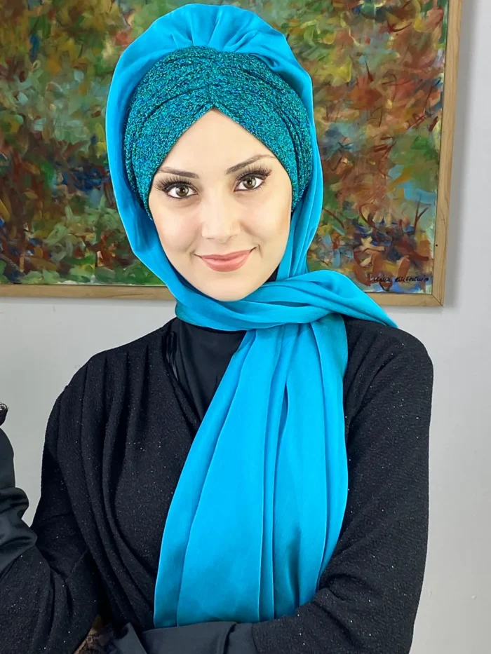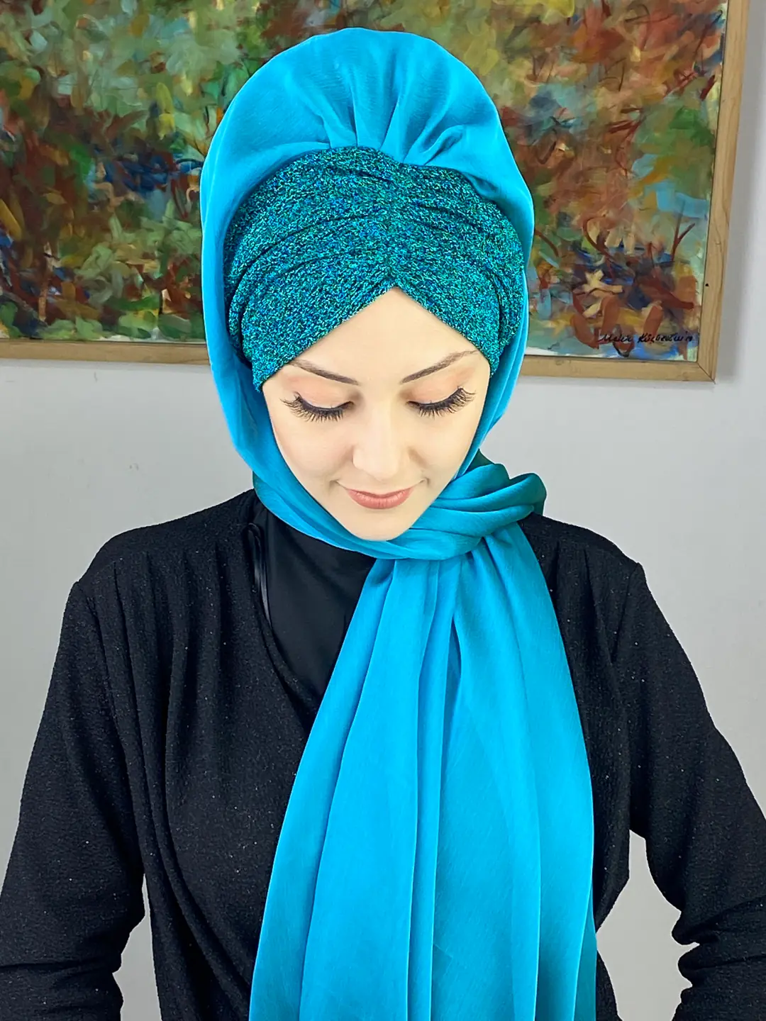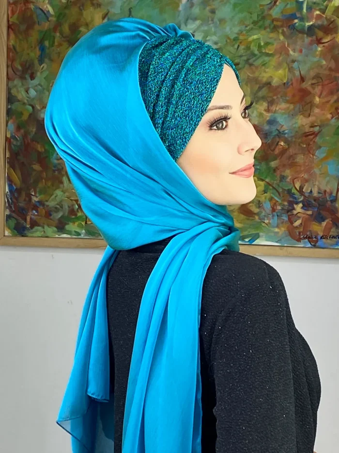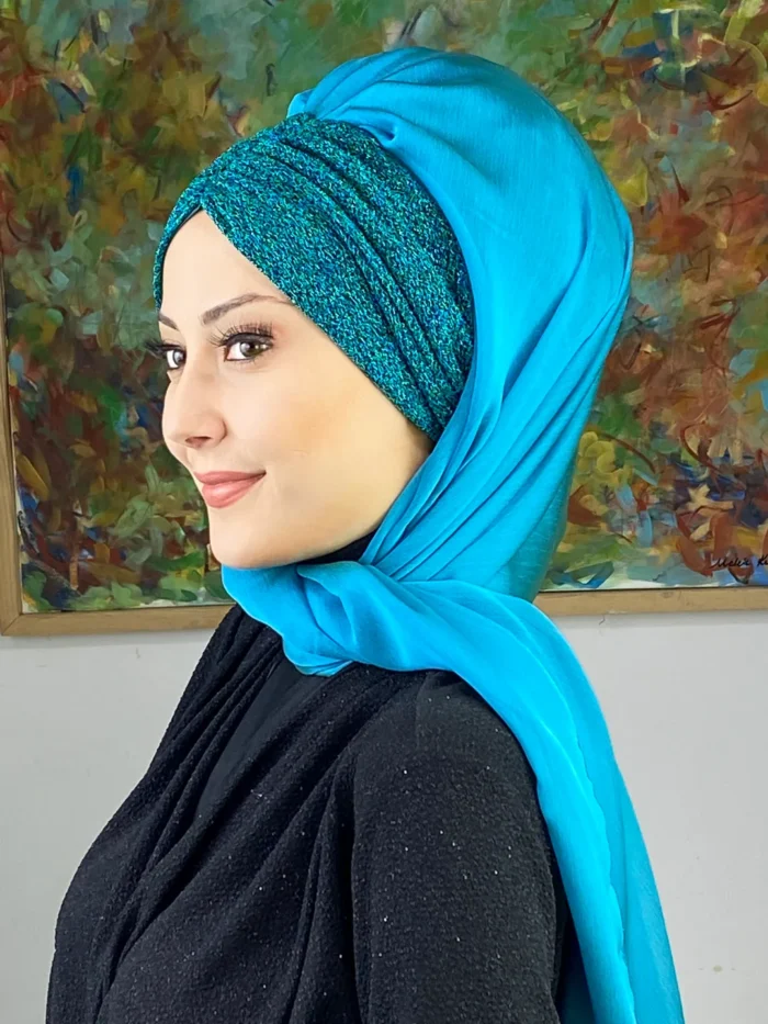 Sultan Model Fransız Şifon Büzgülü Şal – Camgöbeği, zarif mavi tonlarını yeşil alt tonlarla birleştirerek ferahlığın ve tazeliğin sembolü hâline gelir.