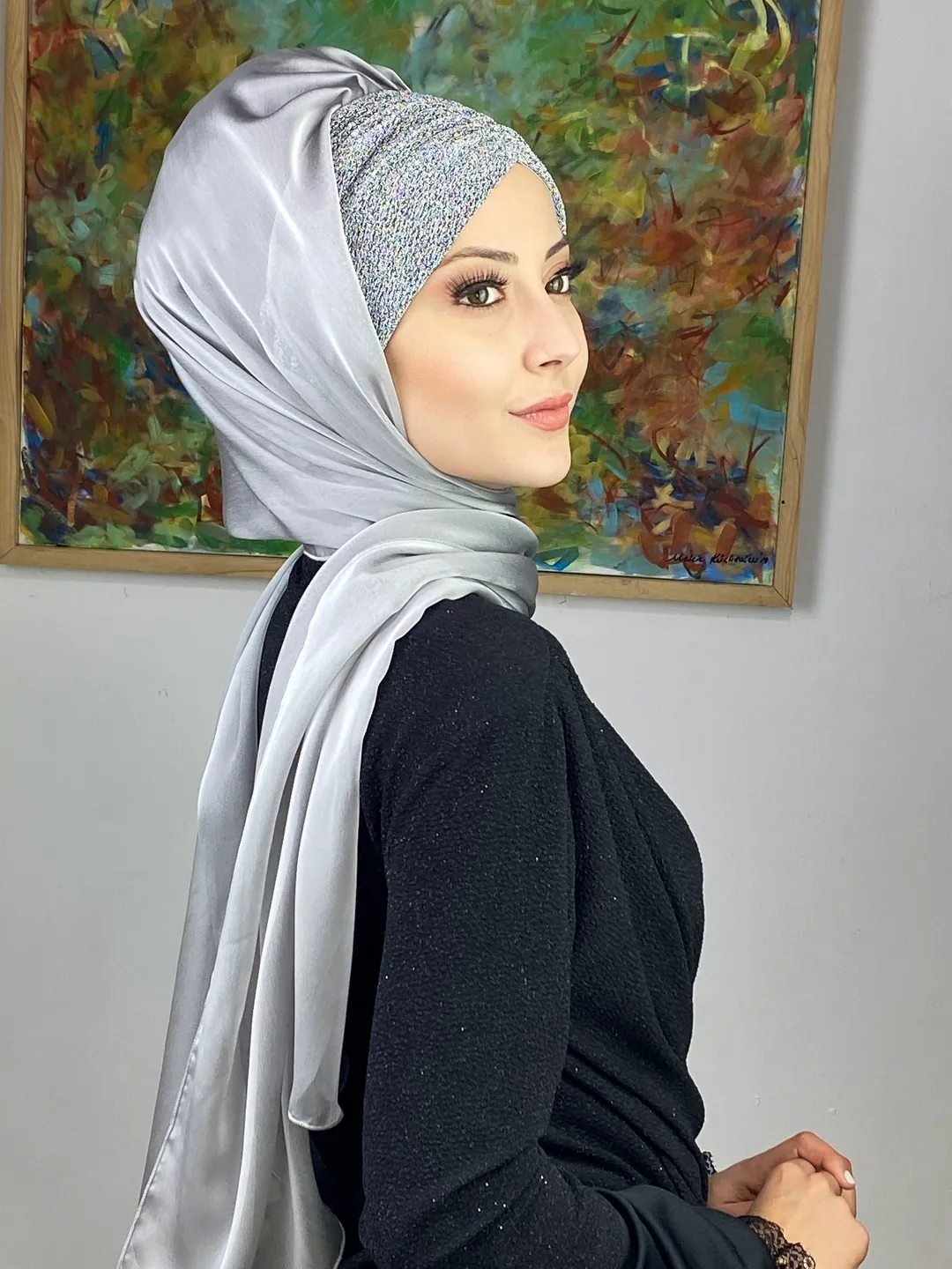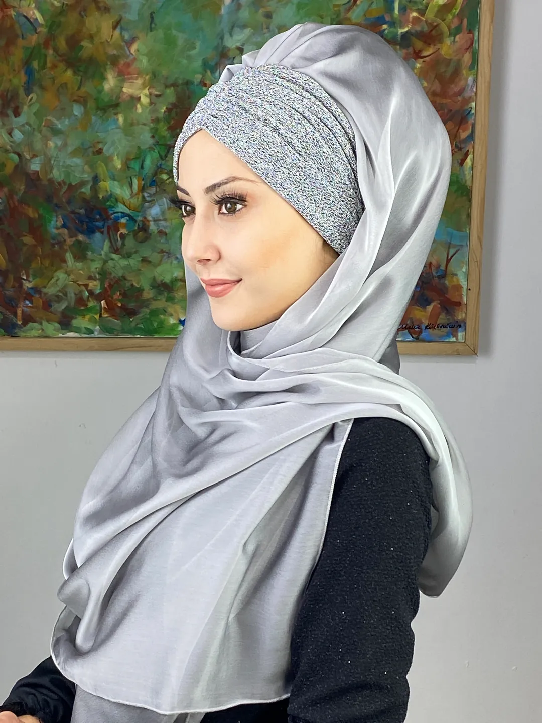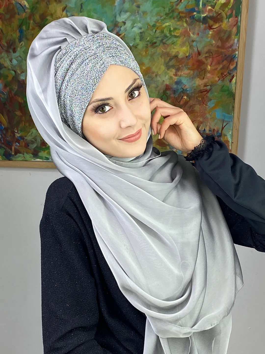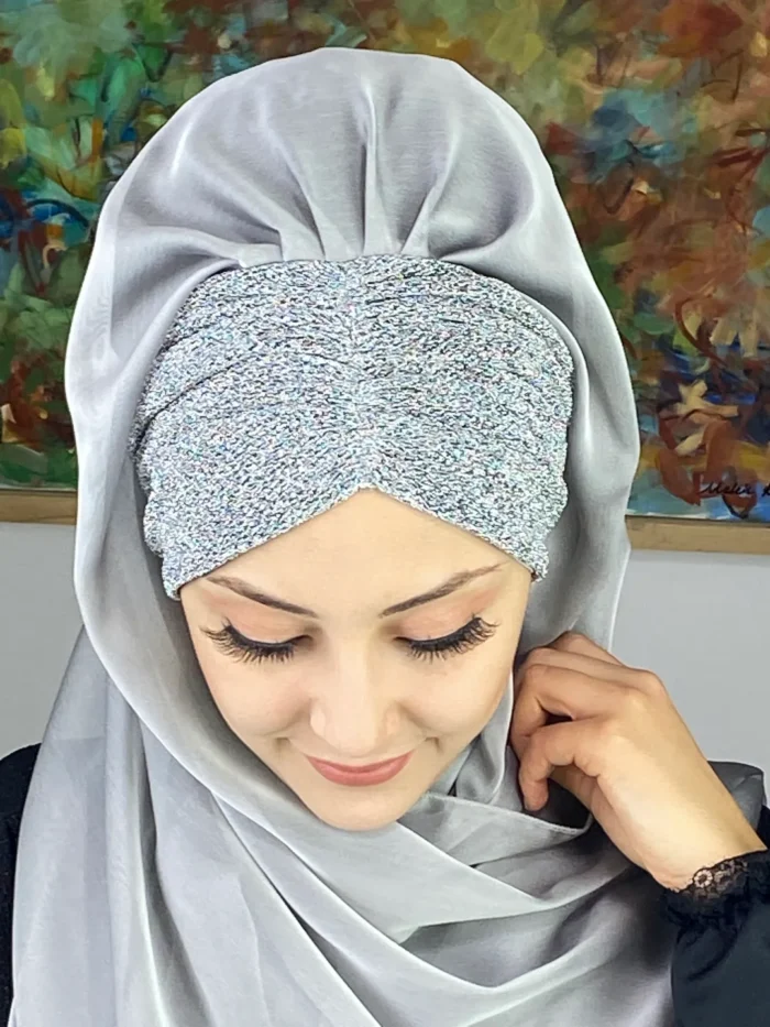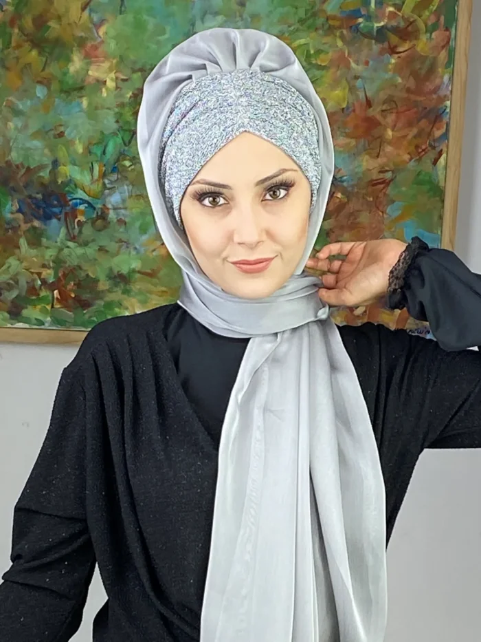 Sultan Model Fransız Şifon Büzgülü Şal – Gümüş ✨