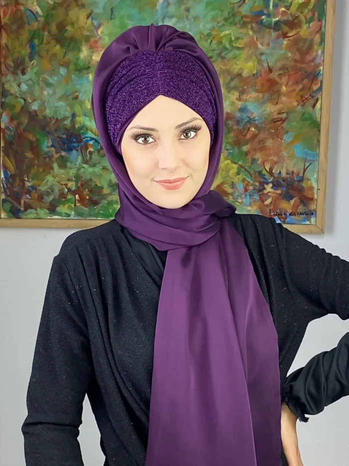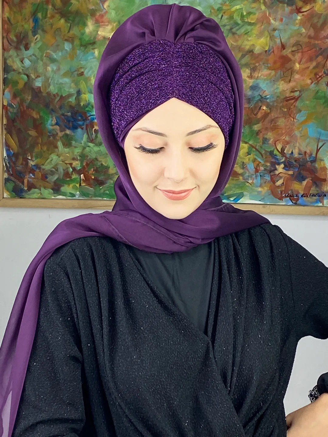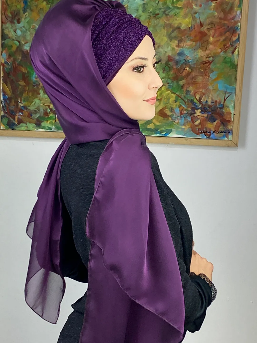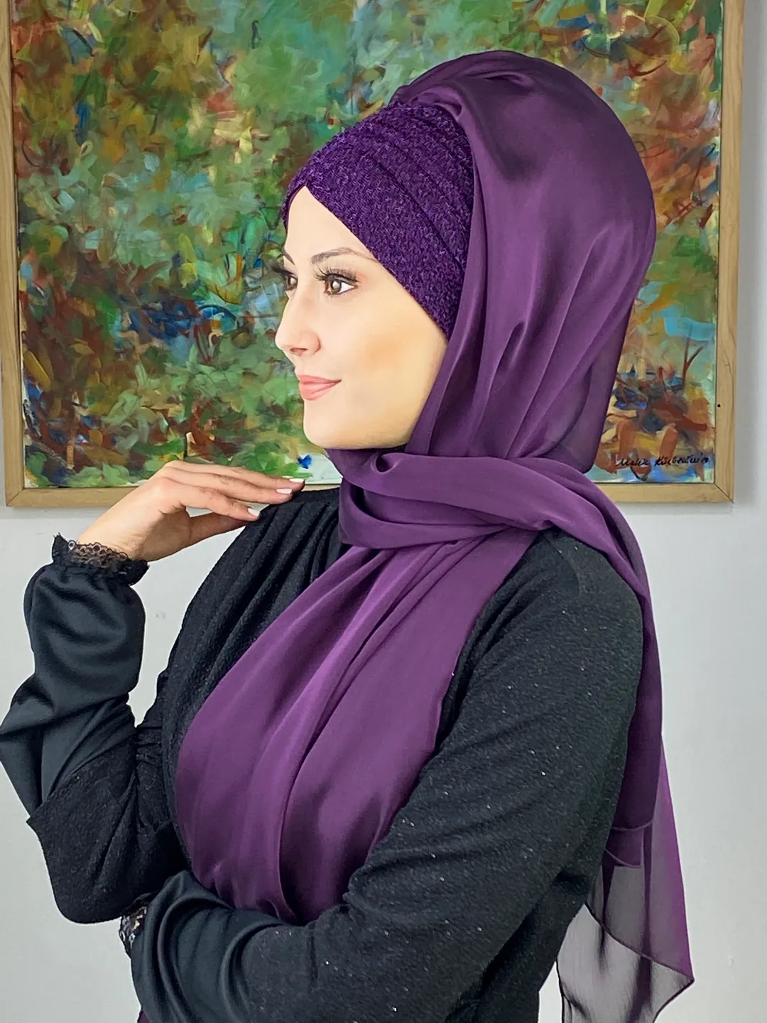 Sultan Model Fransız Şifon Büzgülü Şal – Mor, derin tonuyla sofistike bir şıklık sunar.
