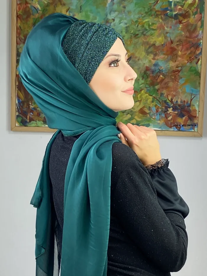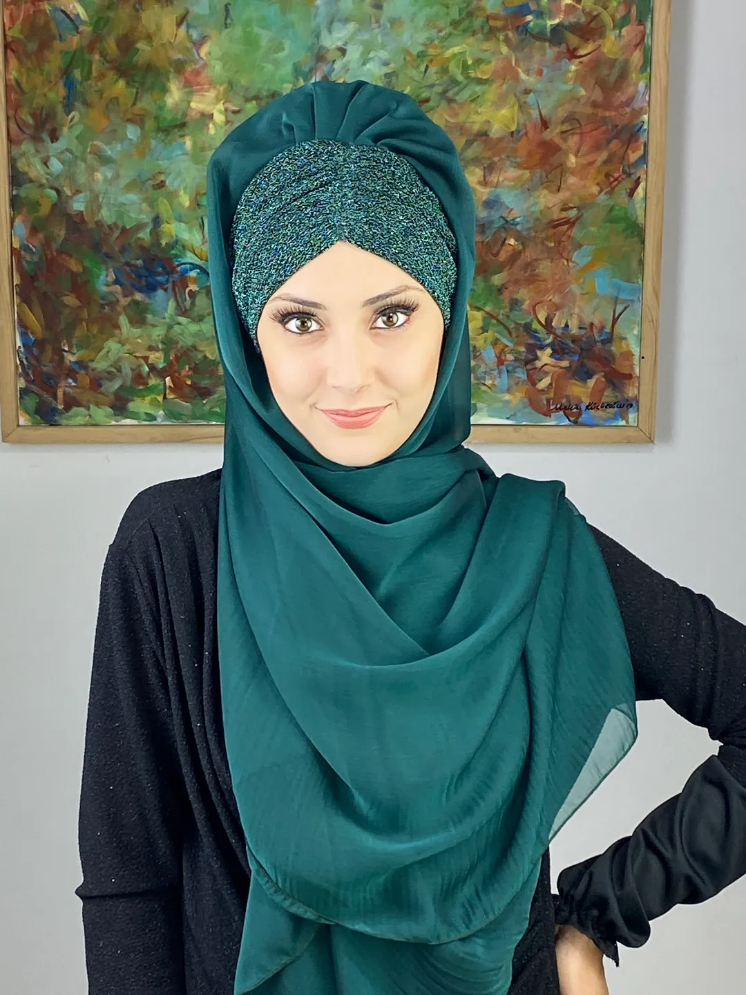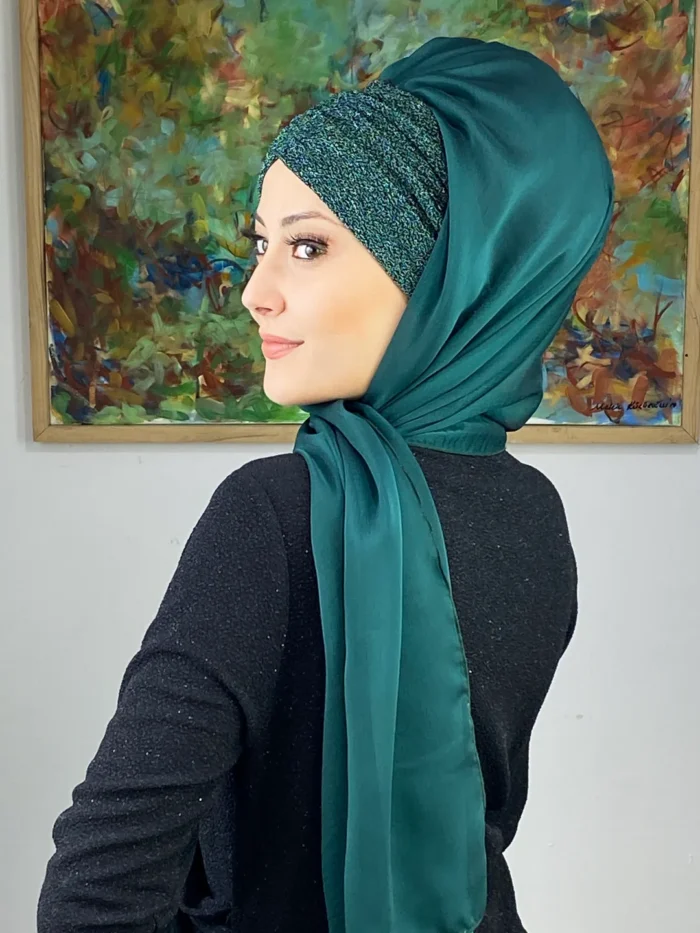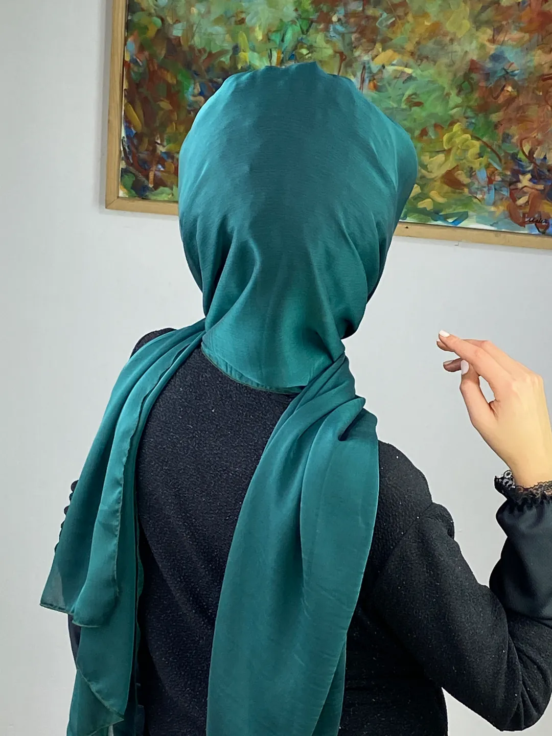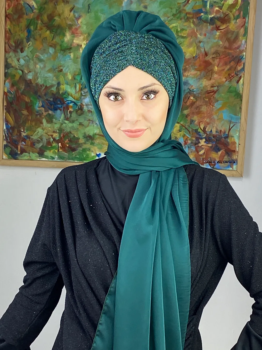 Sultan Model Fransız Şifon Büzgülü Şal – Zümrüt Yeşili, doğanın en zarif tonunu modern tesettür anlayışıyla buluşturur.