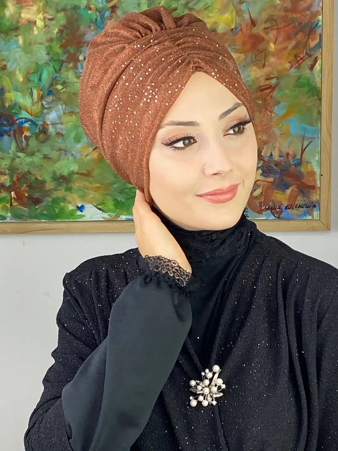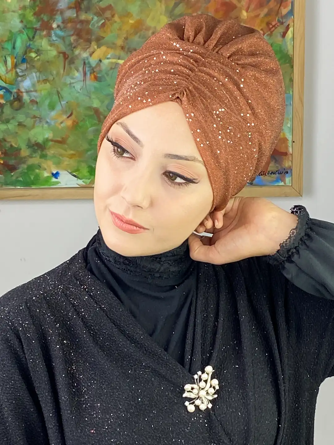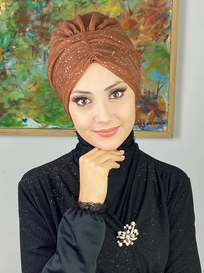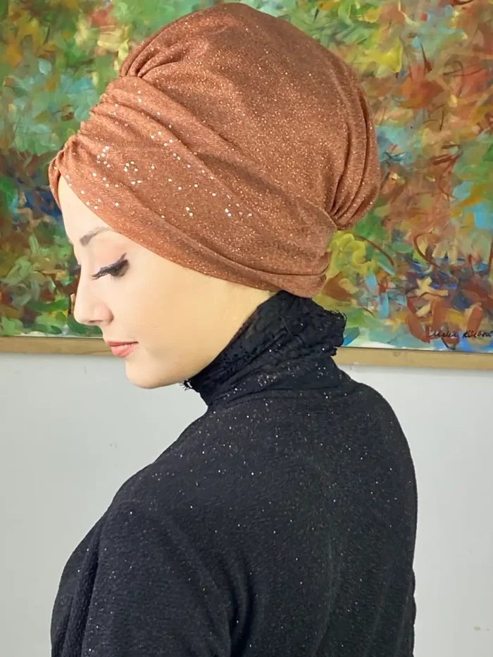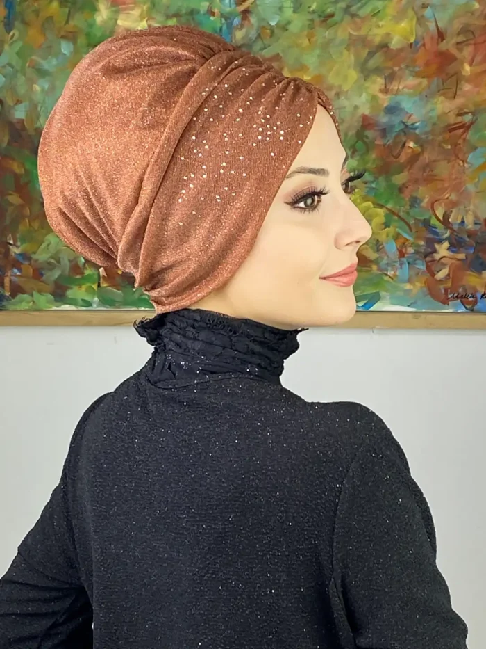Açık bakır büzgülü bone, pastel ve toprak tonlu kombinlerle uyumlu şekilde şıklığınızı tamamlar. Günlük stilinizi sıcak bir dokunuşla zenginleştirir, özel davetlerde ise göz alıcı bir detay olur.