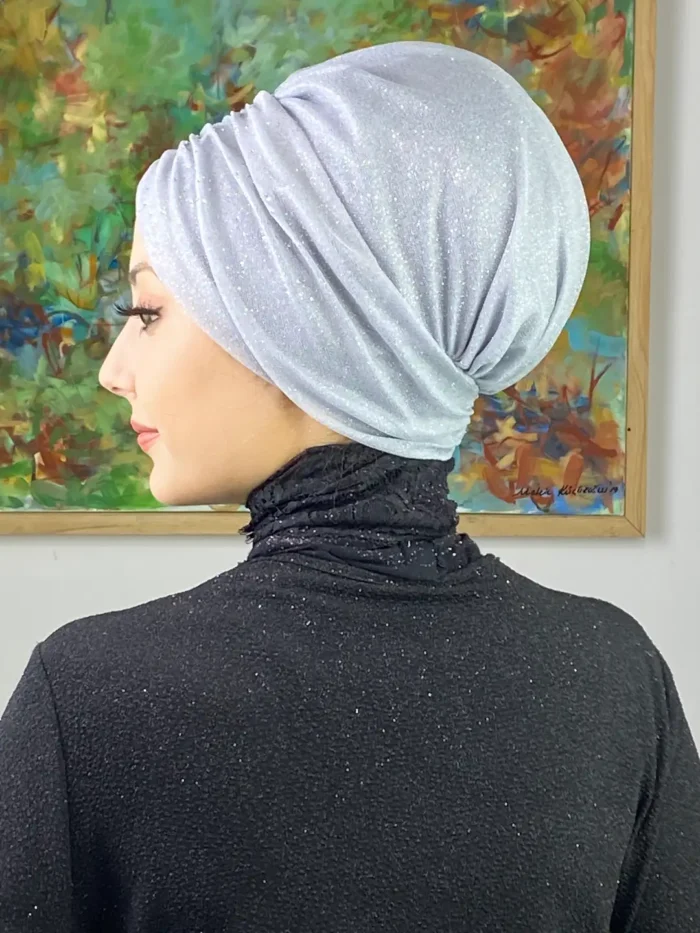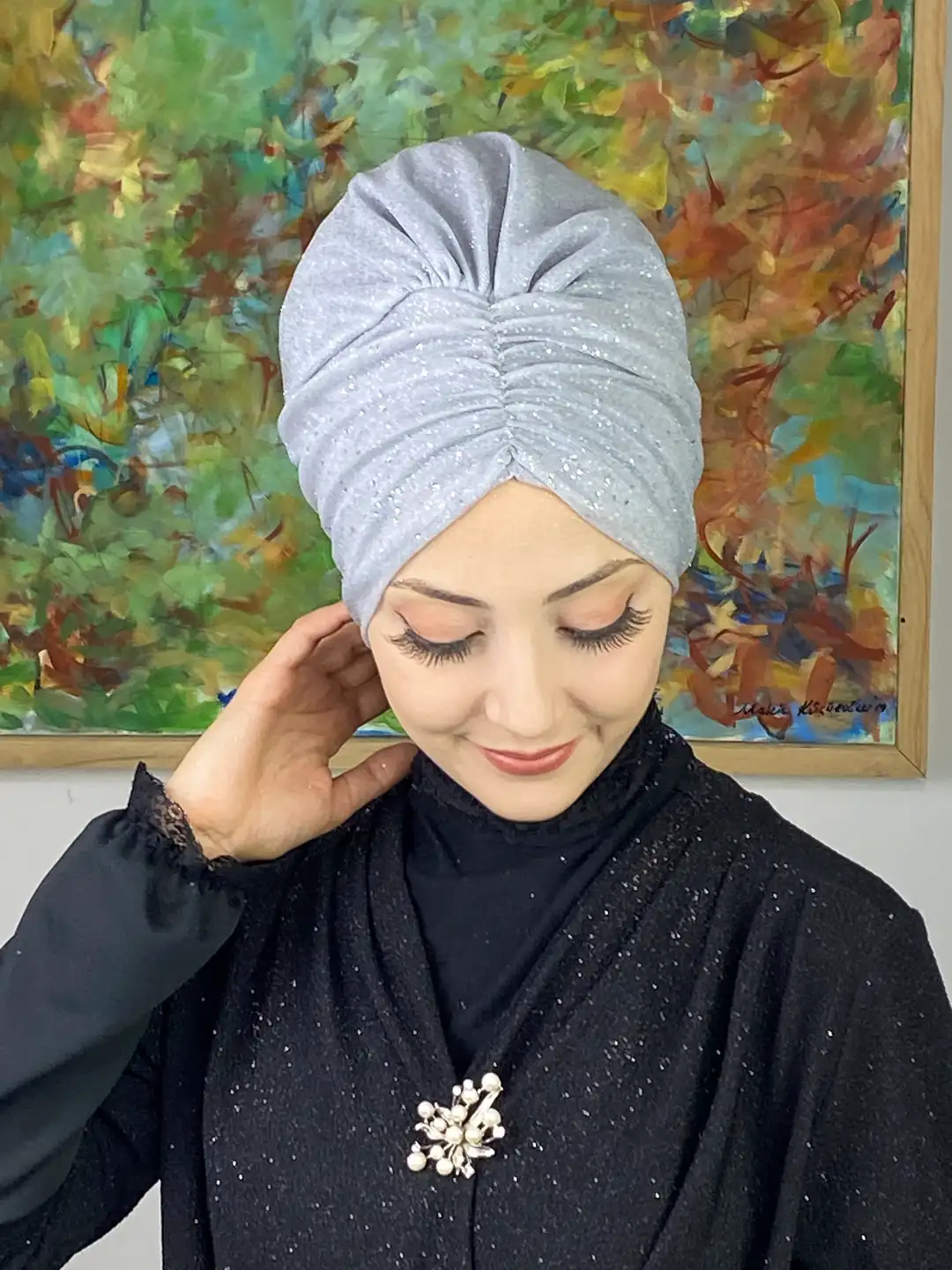 Gümüş Büzgülü Tesettür Bone ile Işıltılı Zarafet