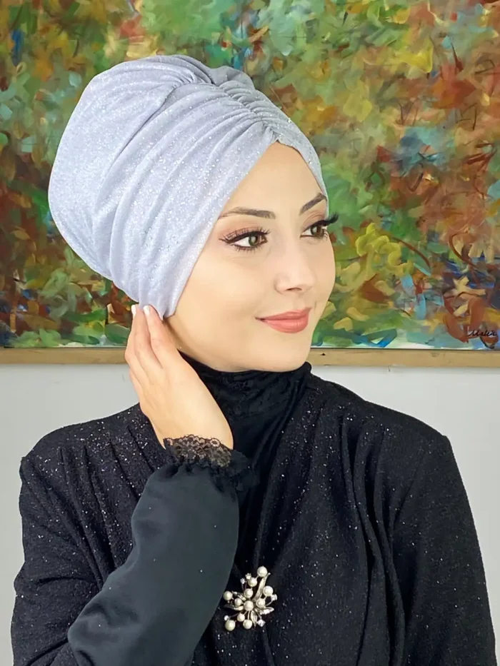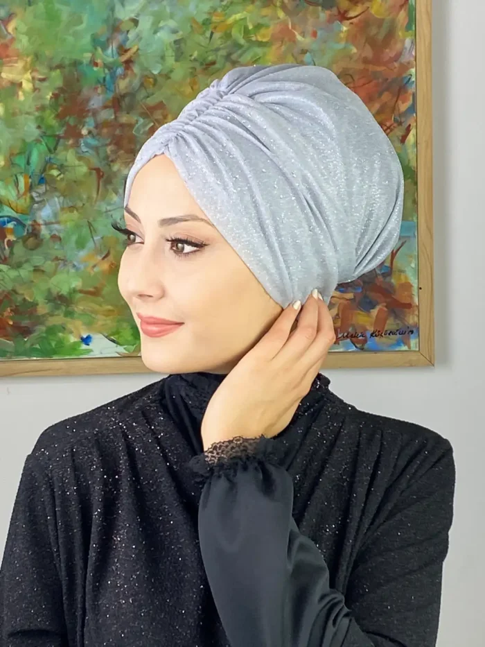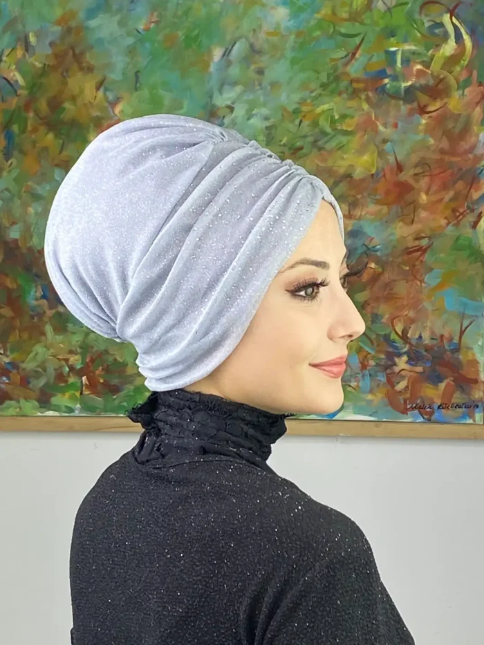 Gümüş büzgülü tesettür bone ile stilinizi hem zarif hem ışıltılı bir şekilde tamamlayın.