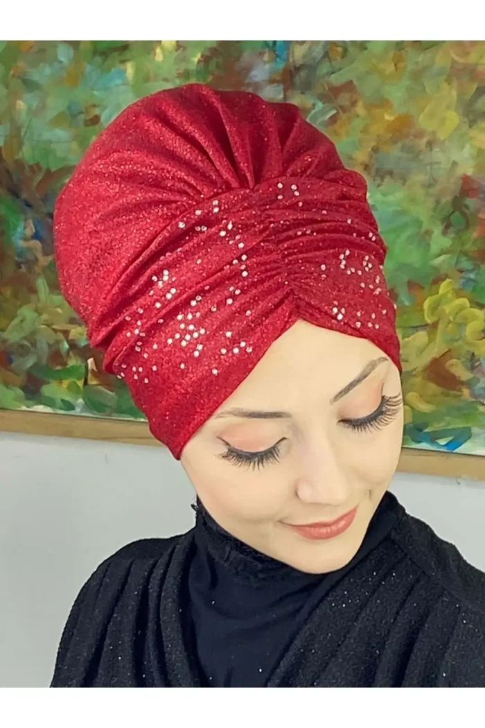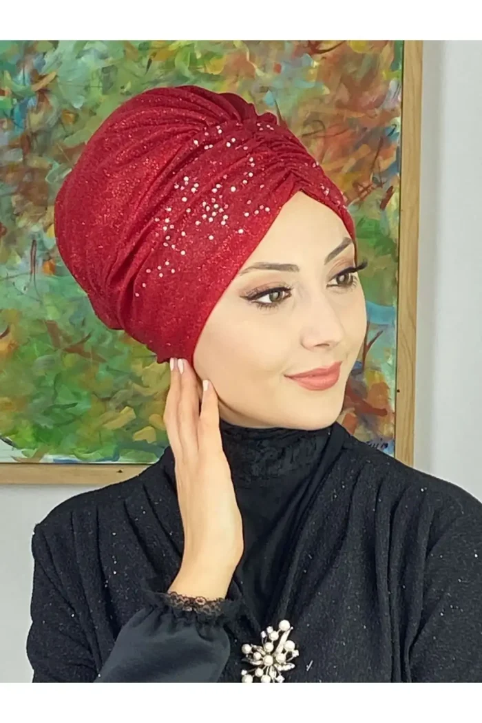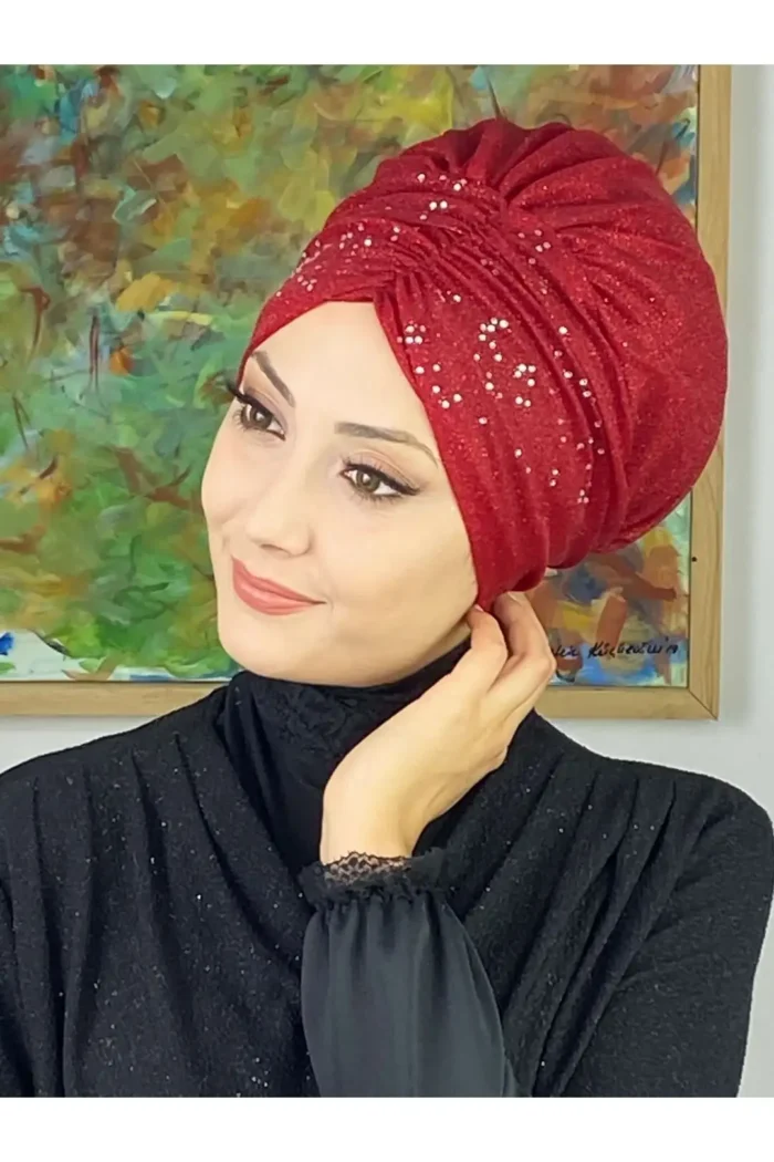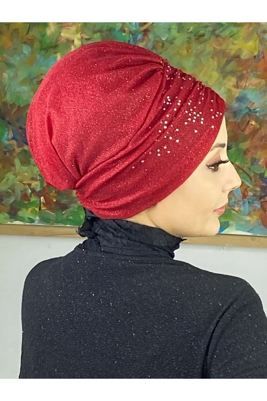 Kırmızı Simli Büzgülü Tesettür Bone ile Işıltını Konuştur