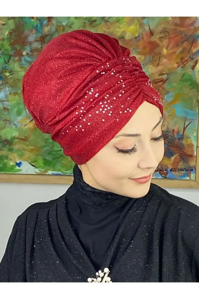 Kırmızı simli büzgülü bone, siyah, bej, krem ve altın tonlarıyla mükemmel uyum sağlar. Özel günlerde abiye kombinlerle, günlük hayatta sade şallarla rahatlıkla kullanılabilir.