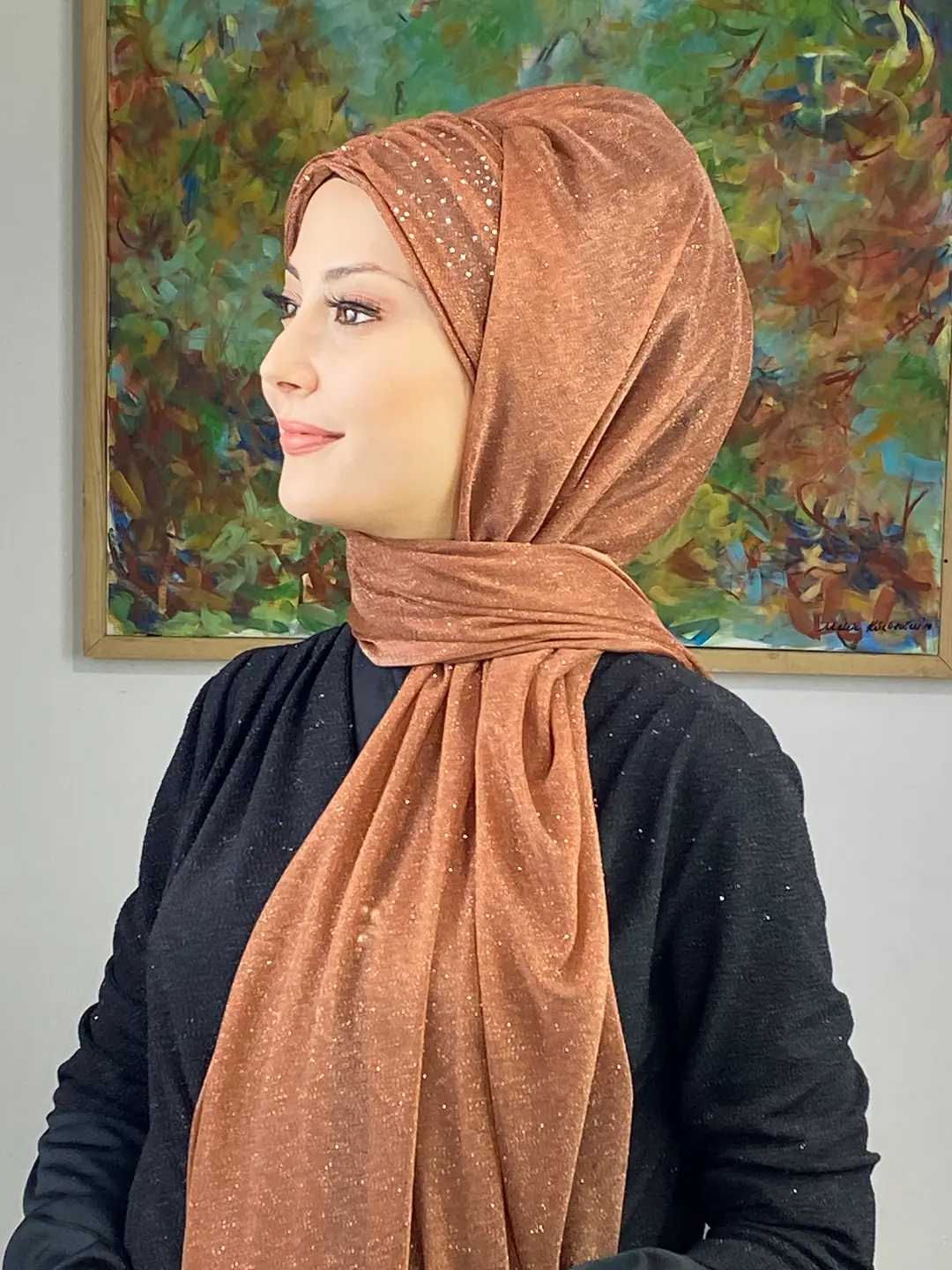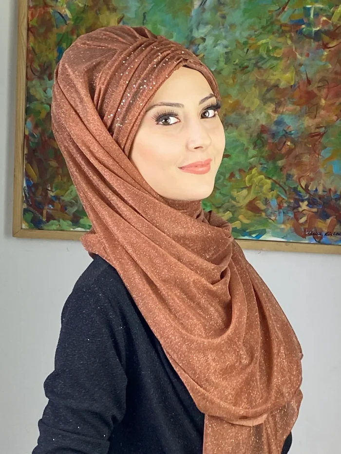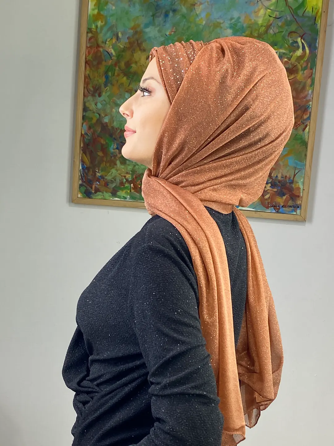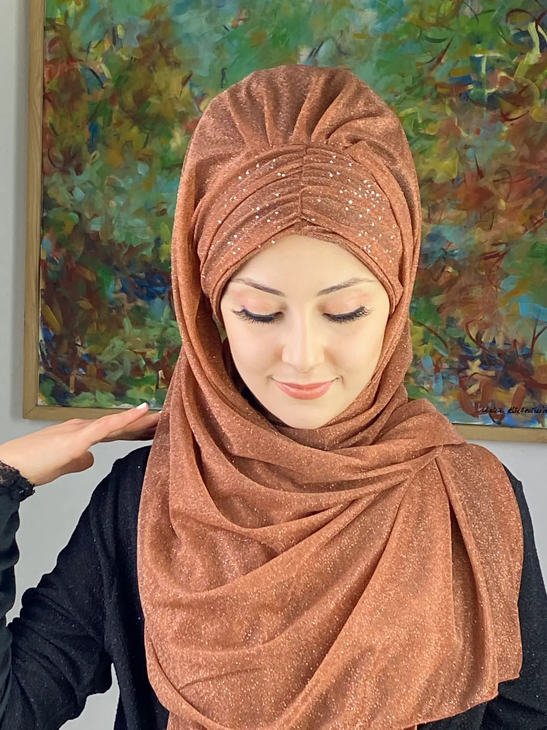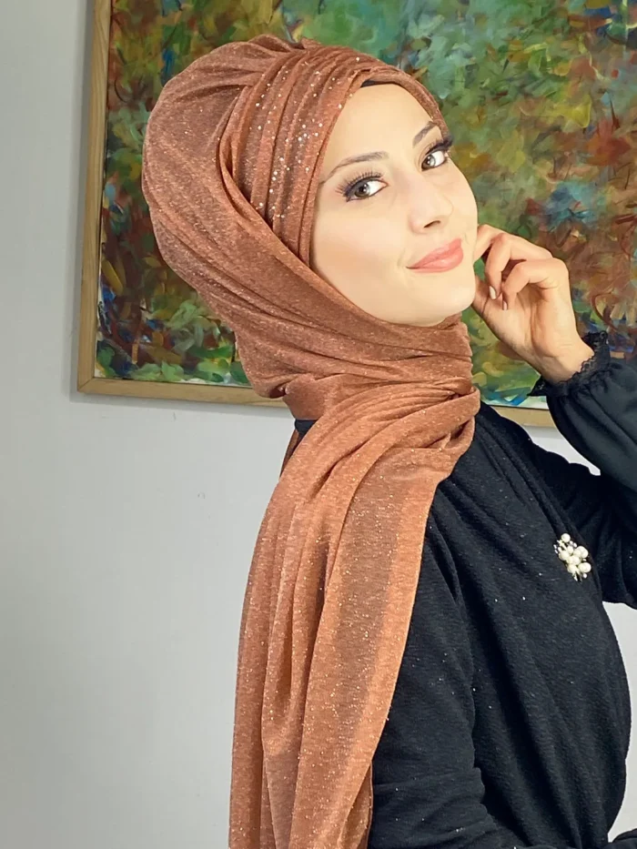 Sultan Model Simli Fransız Şifon Büzgülü Şal – Bakır,