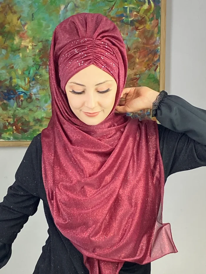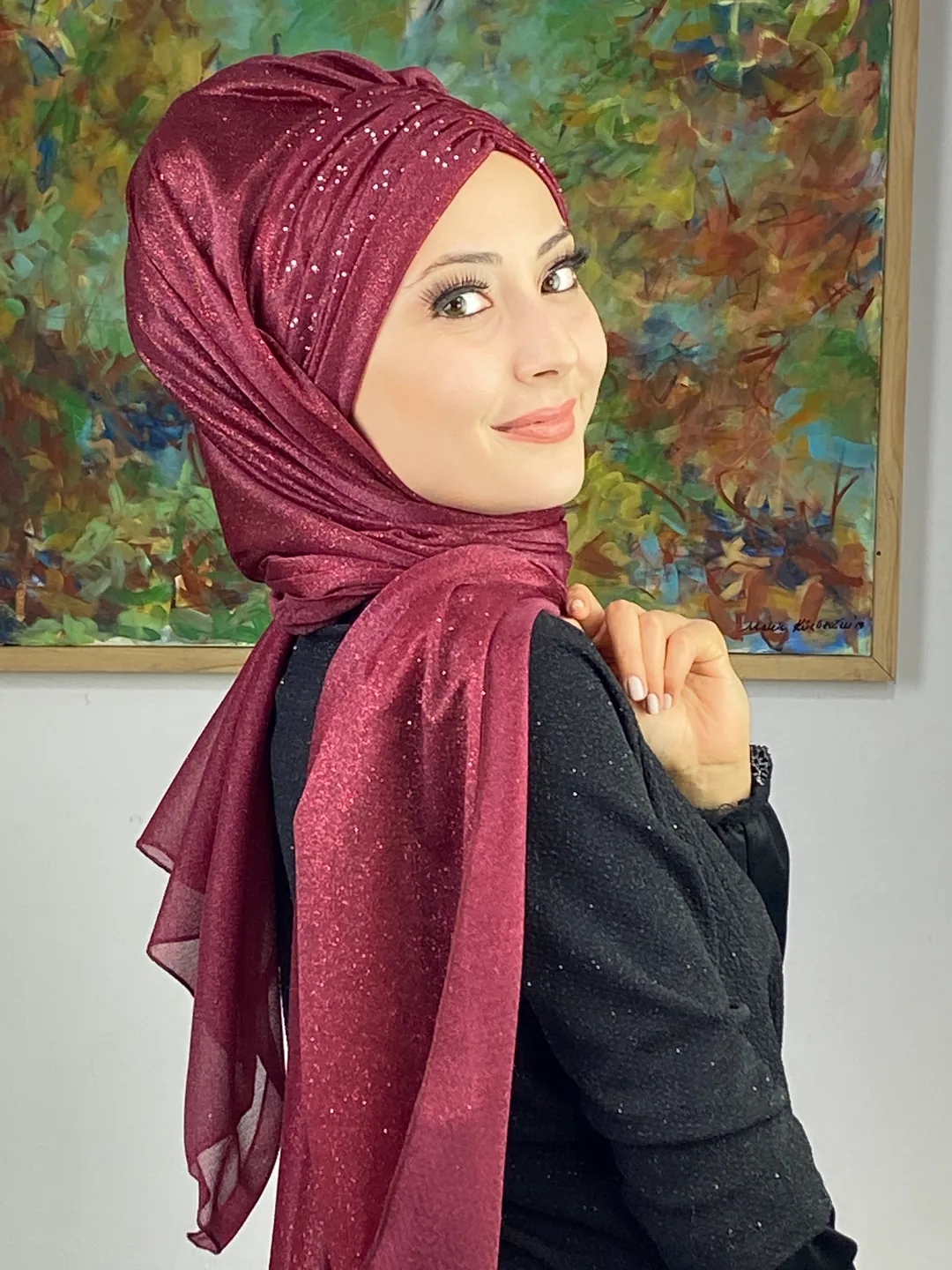 Sultan Model Simli Fransız Şifon Büzgülü Şal – Bordo,