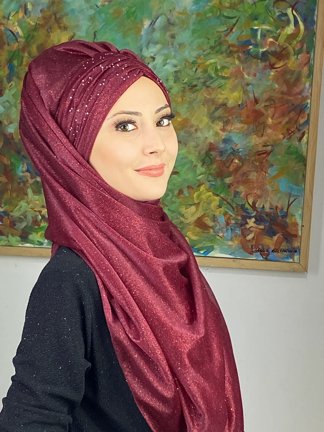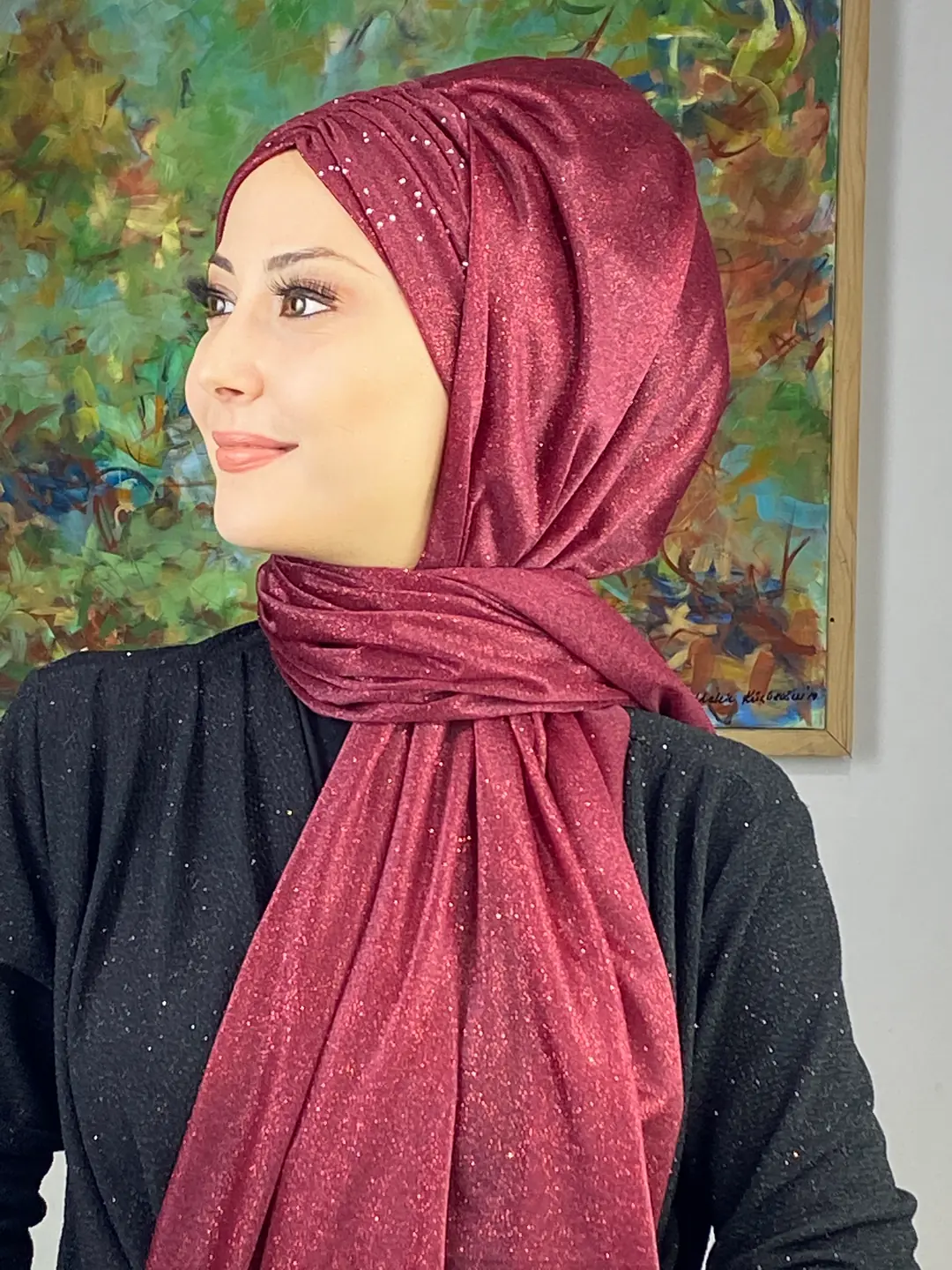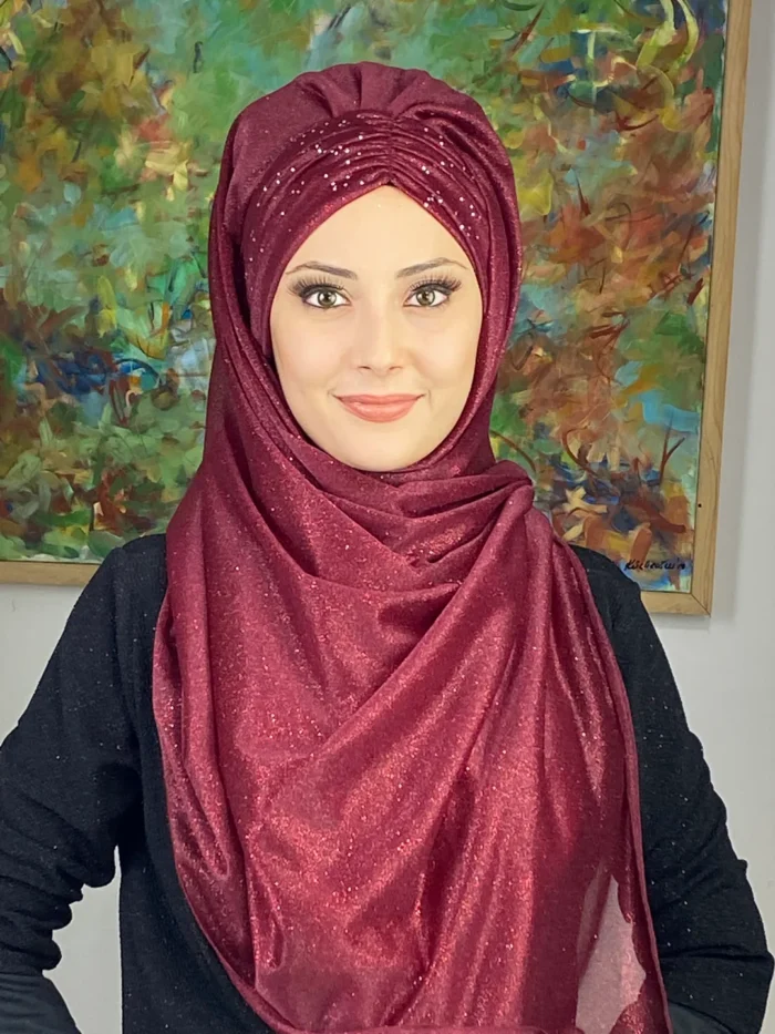 Sultan Model Simli Şifon Büzgülü Şal – Bordo