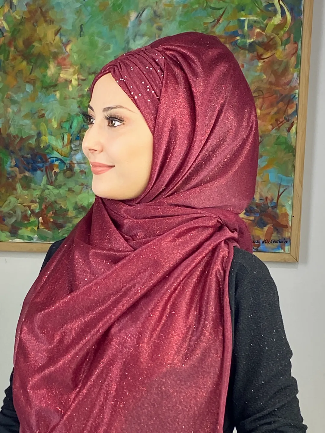 Sultan Model Simli Fransız Şifon Büzgülü Şal – Bordo ❤️