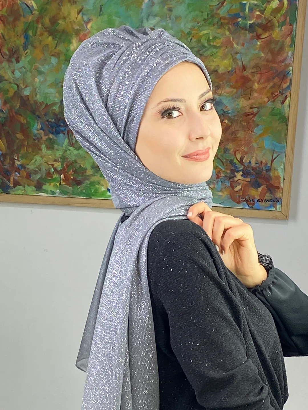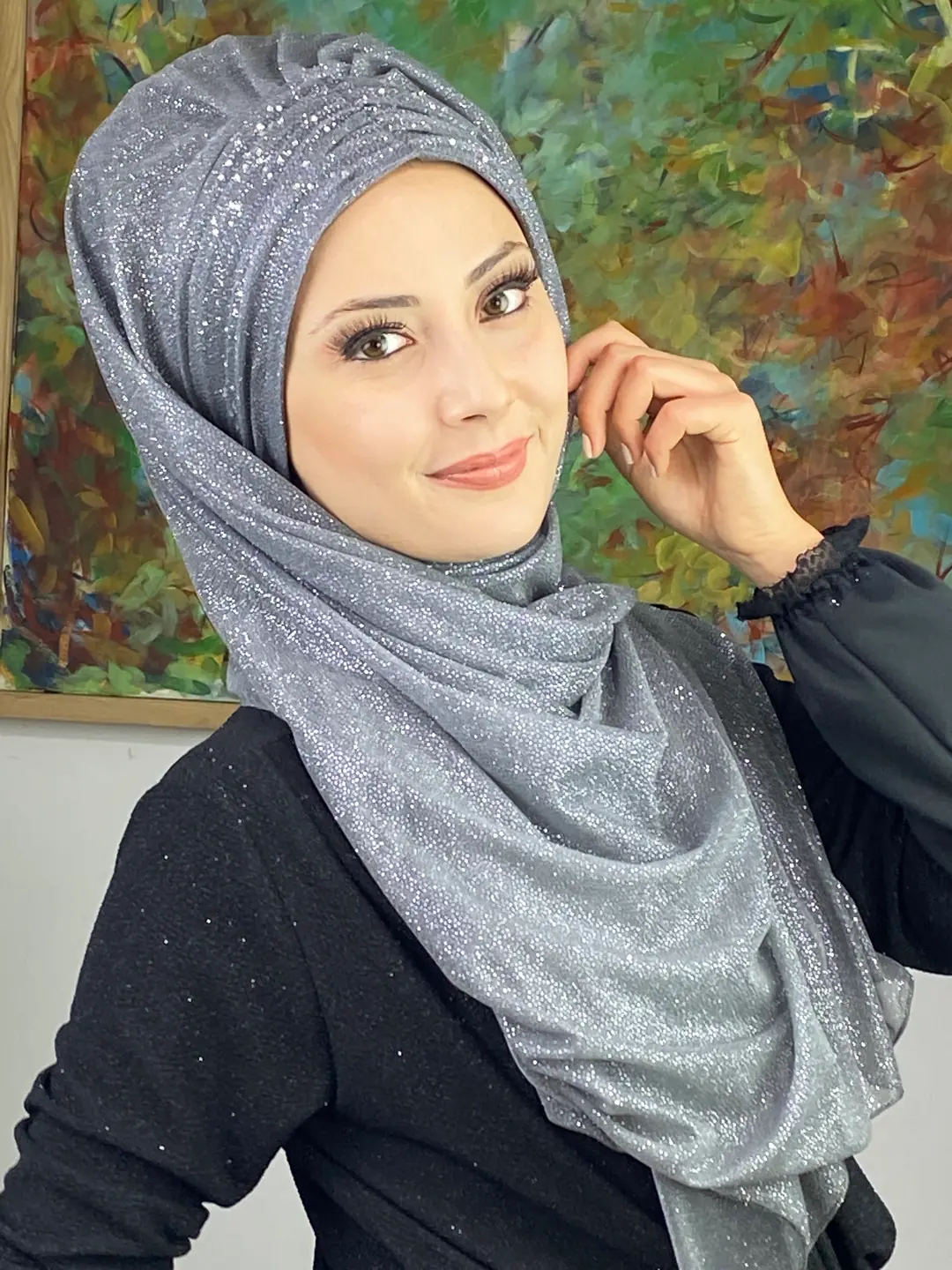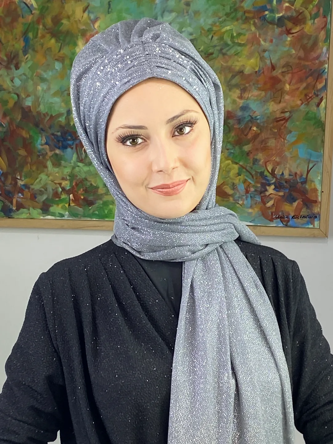 Sultan Model Simli Şifon Büzgülü Şal – Gri,