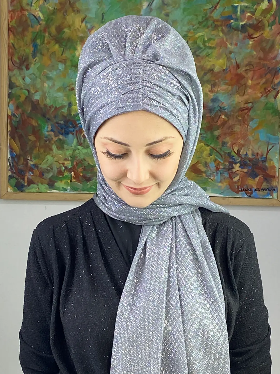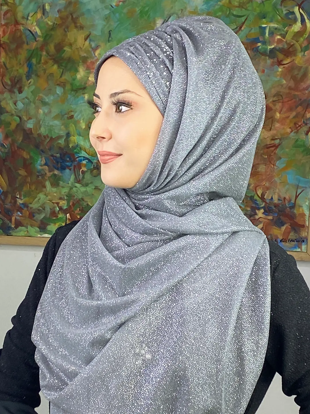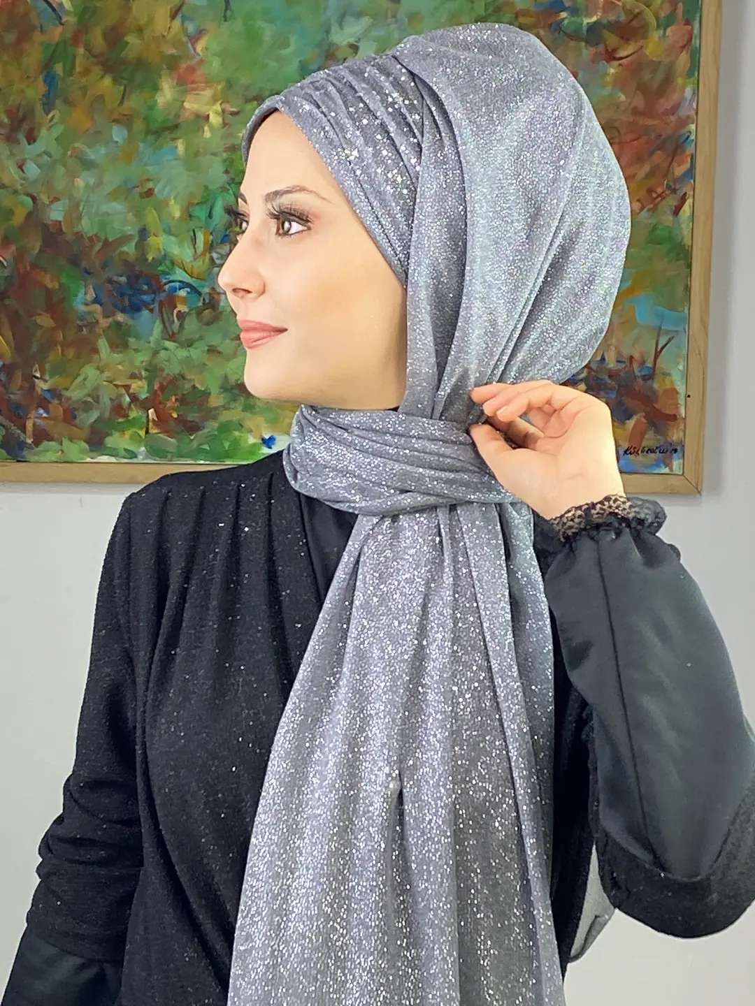 Sultan Model Simli Şifon Büzgülü Şal – Gri,