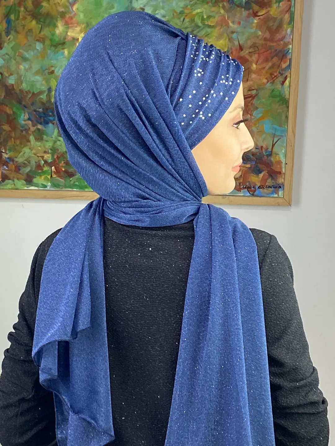 Koyu lacivert tonunun derinliği, simli şifonun parıltısıyla birleşerek