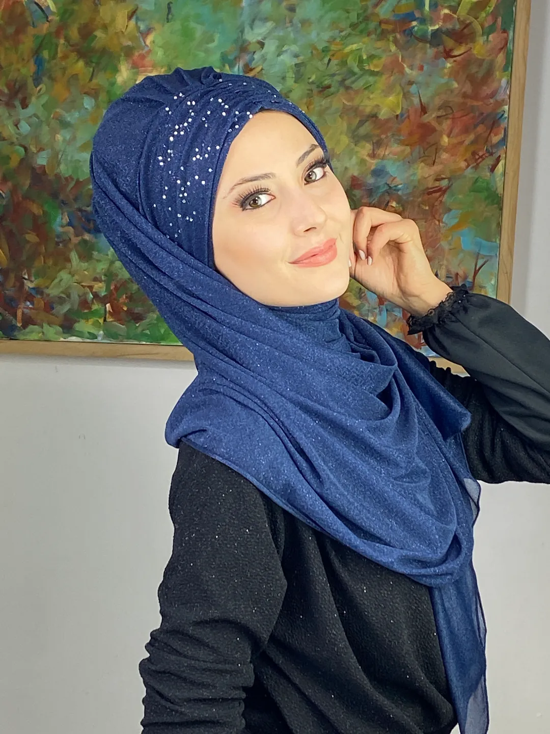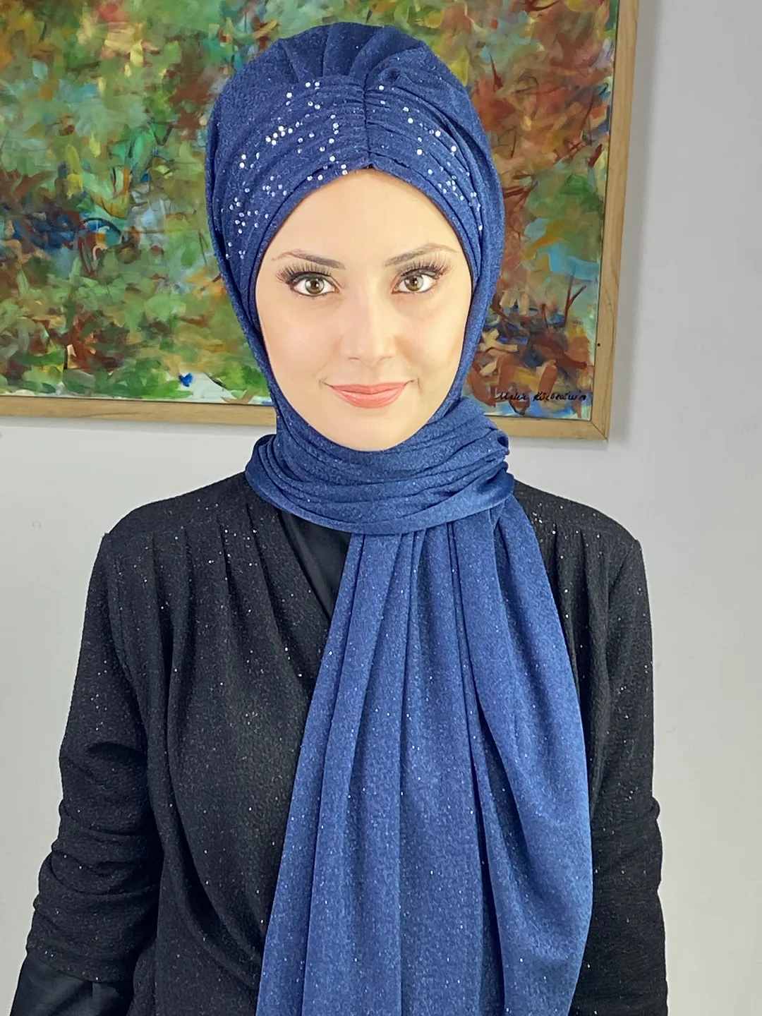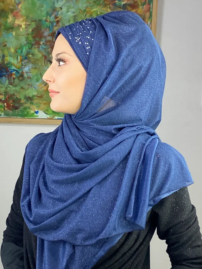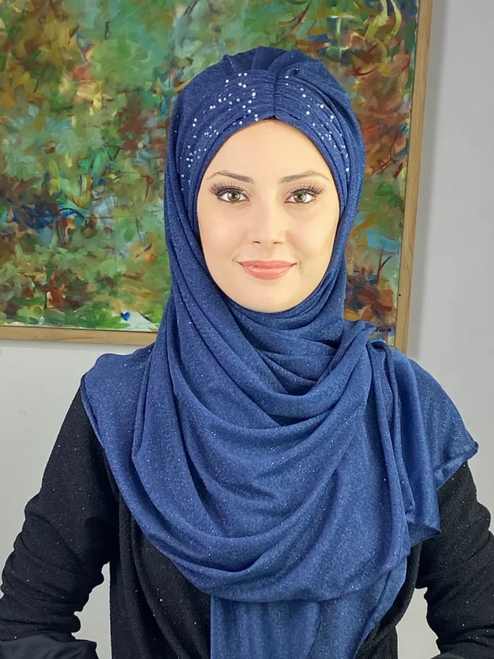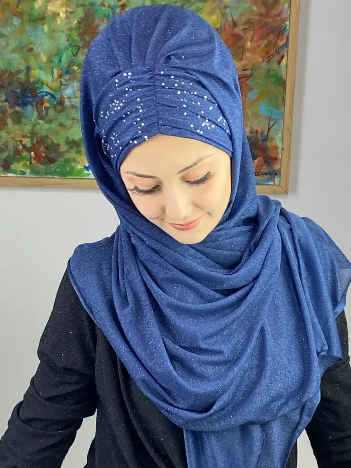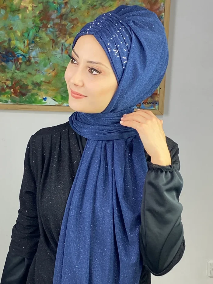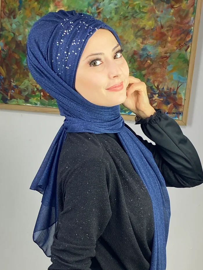 Sultan Model Simli Şifon Büzgülü Şal – Koyu Lacivert,