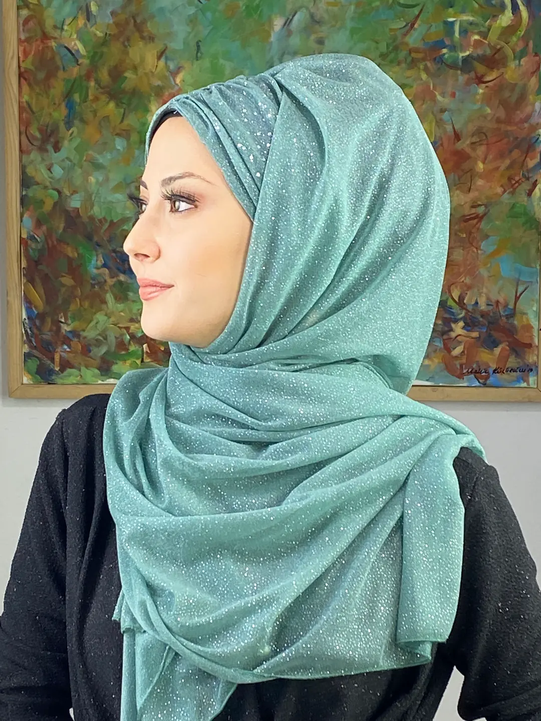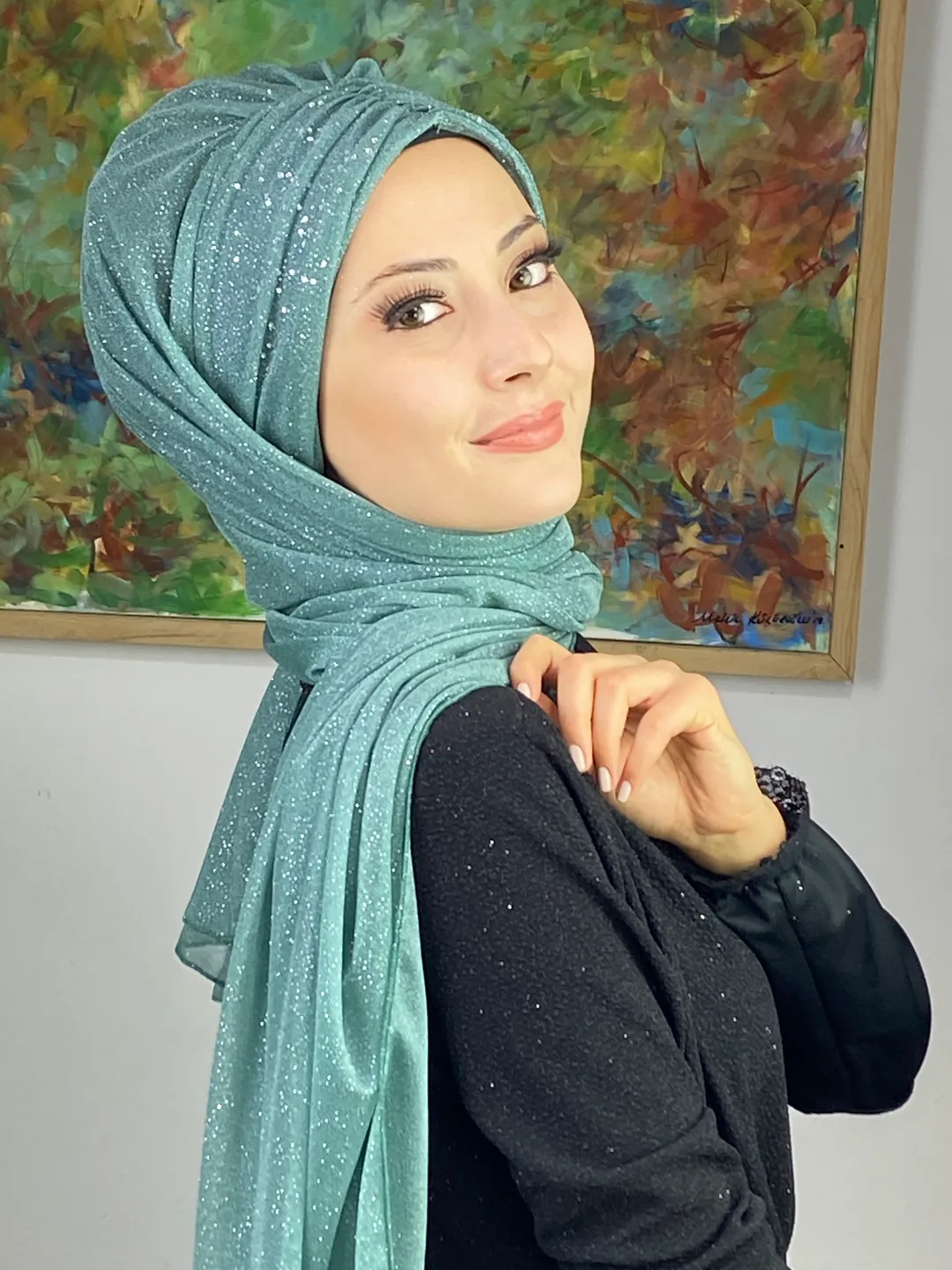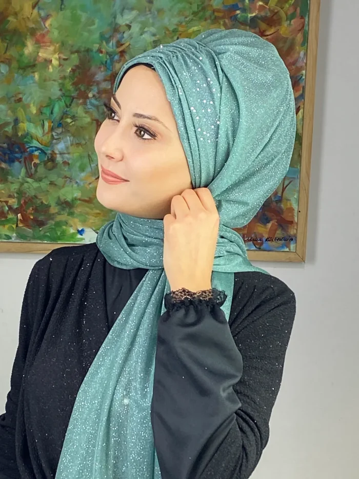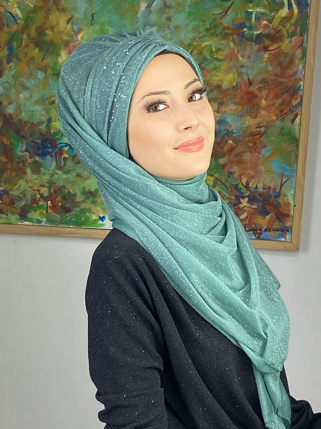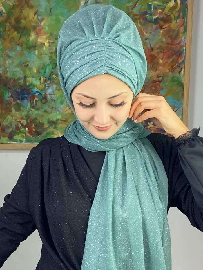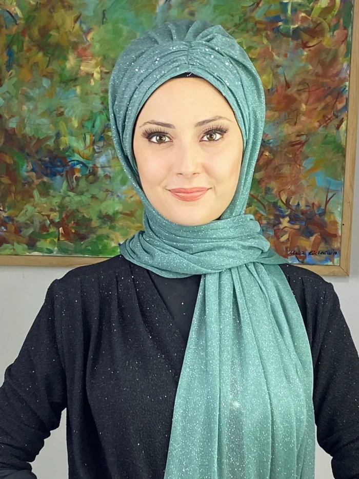 Sultan Model Simli Şifon Büzgülü Şal – Su Yeşili,
