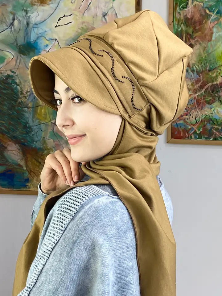 Sütlü kahve, doğal ve huzur verici bir renk tonudur. Bu şapka, bu tonun zarifliği ile şıklığınızı vurgular. Taşlı tokası, şapkanın sade yapısını modern bir dokunuşla tamamlar. Şapkanın tasarımındaki taşlar, şıklığı artırırken, sütlü kahve tonunun zarif havasını da pekiştirir.