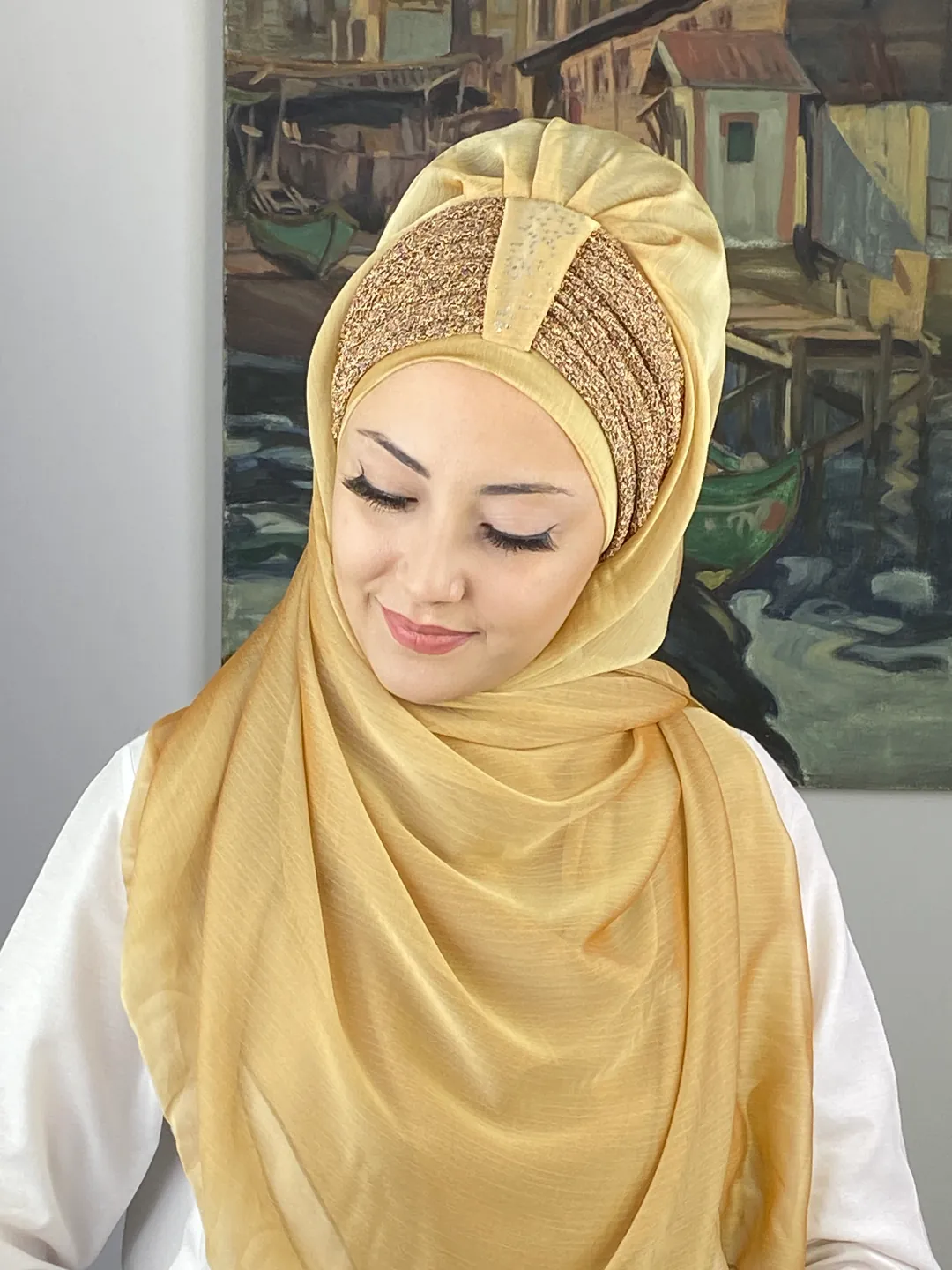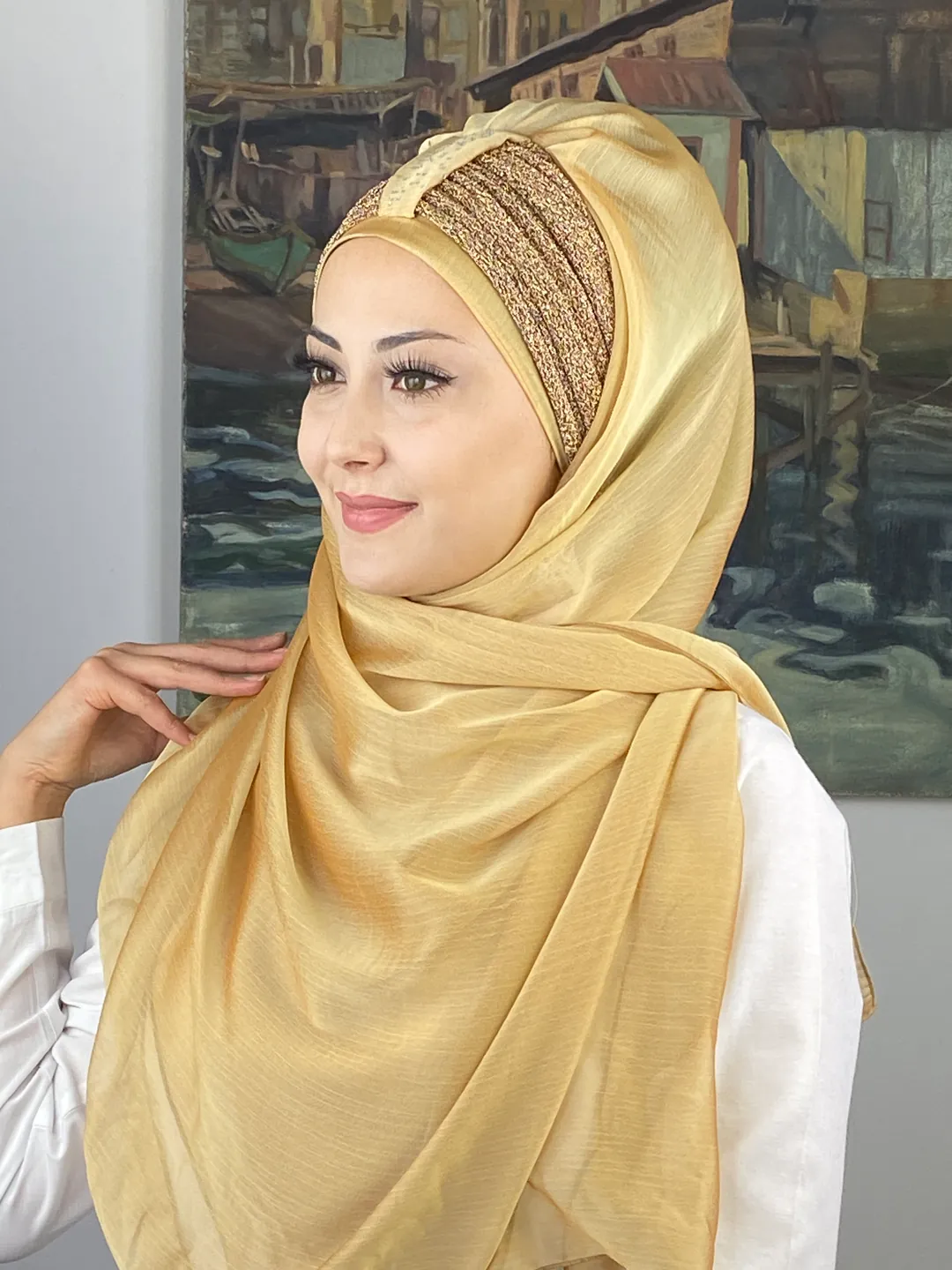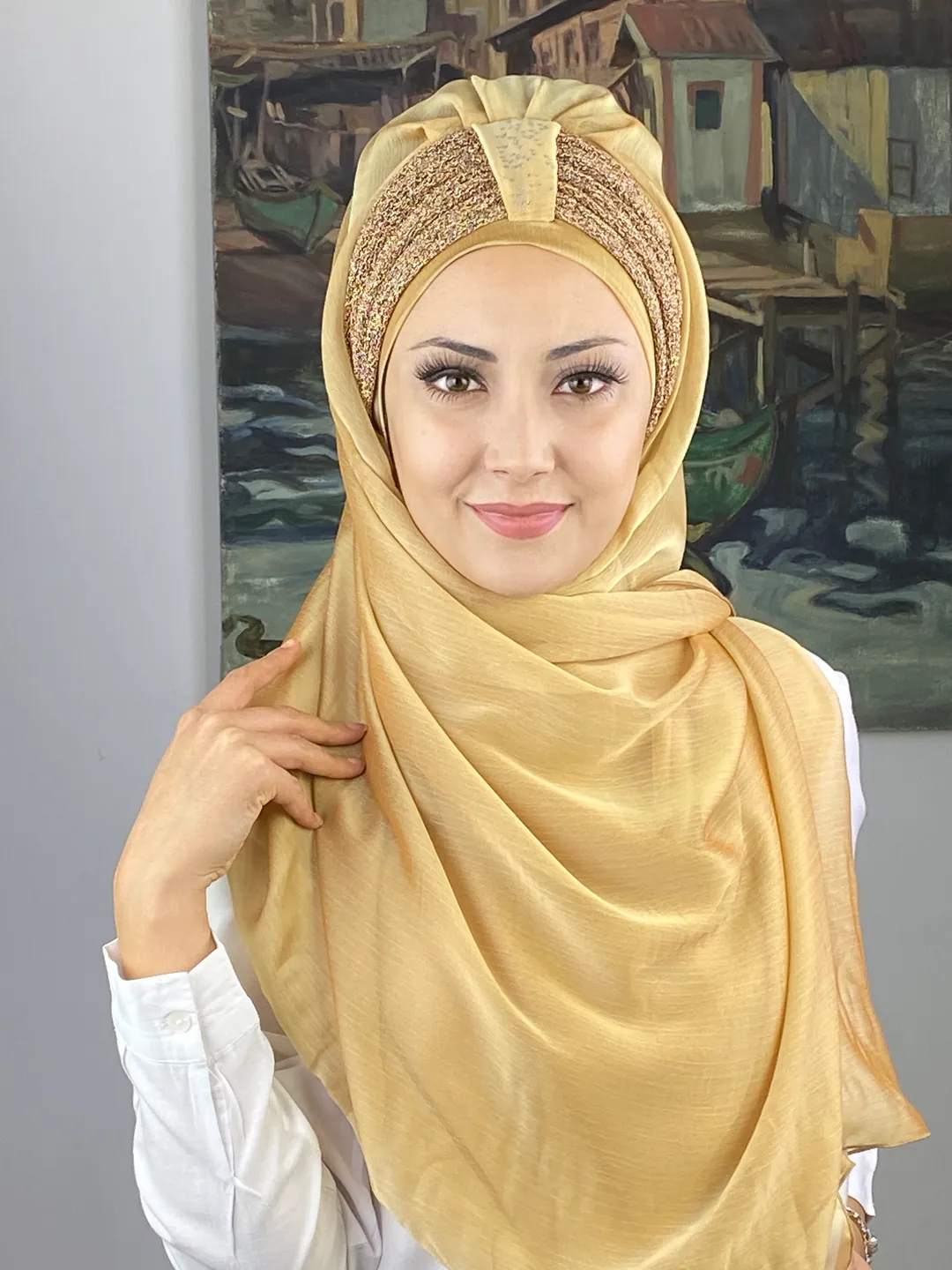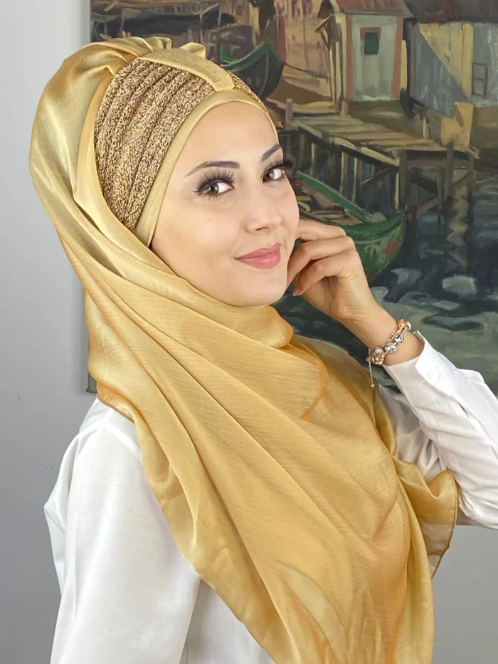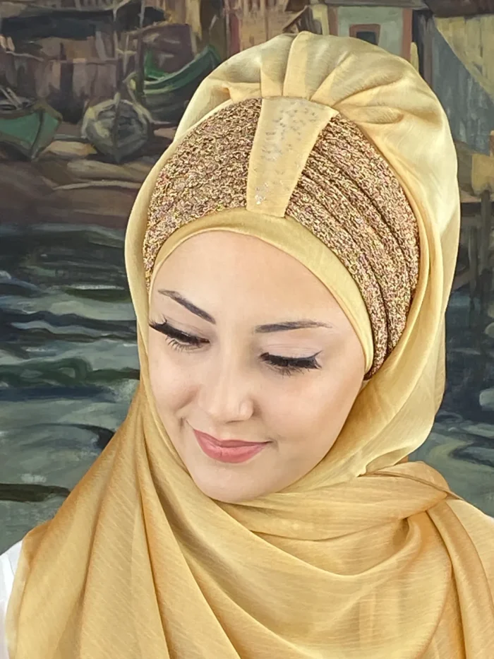 Göz alıcı ama asla abartısız olan bu ton, her yaştan kadın için zarif bir seçenektir. Sultan Model’in benzersiz büzgü yapısı, yüzünüzün doğal güzelliğini vurgular. Fransız şifonun dökümlü yapısı, altın tonunun ışığıyla birleşerek zarafetin sembolü haline gelir.