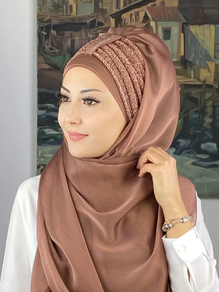 Tek Biritli Sultan Model Büzgülü Fransız Şifon Hazır Şal – Sütlü Kahve, doğallığın zarafetle buluştuğu bir tasarım harikasıdır.