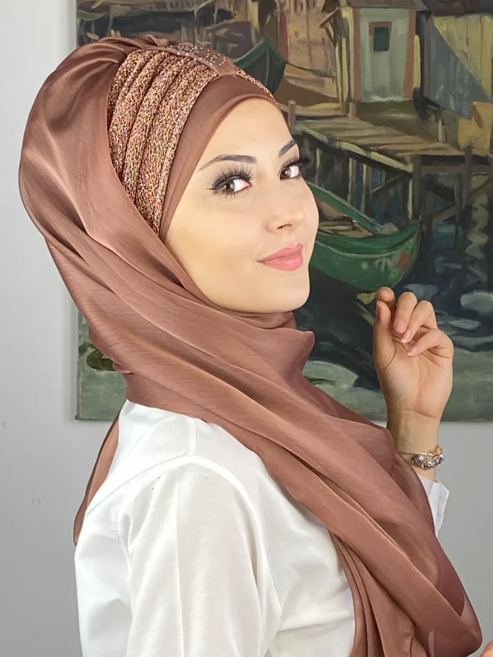 Tek Biritli Sultan Model Büzgülü Fransız Şifon Şal – Sütlü Kahve, özel davetlerden günlük kombinlere kadar çok yönlü bir kullanım sunar.