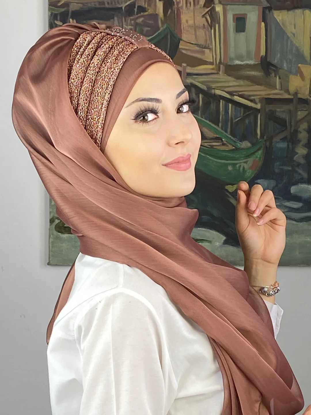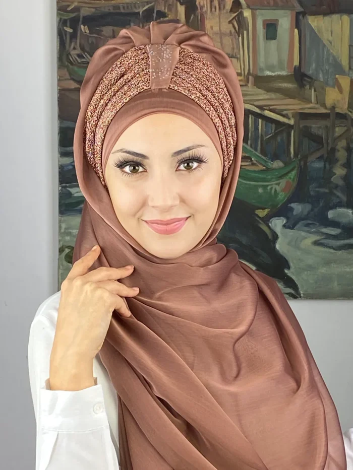 Tek Biritli Sultan Model Büzgülü Fransız Şifon Hazır Şal – Sütlü Kahve