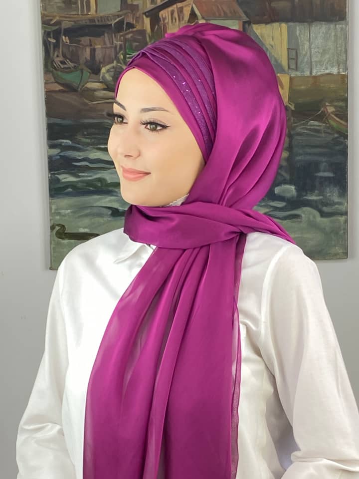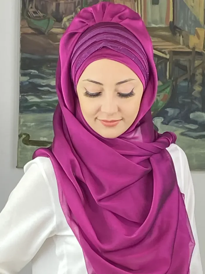 Topkapı Çapraz Drapeli Biritleri Simli Fransız Şifon Hazır Şal – Fuşya