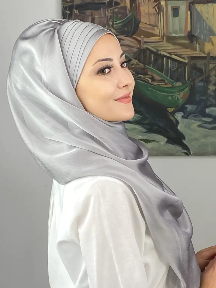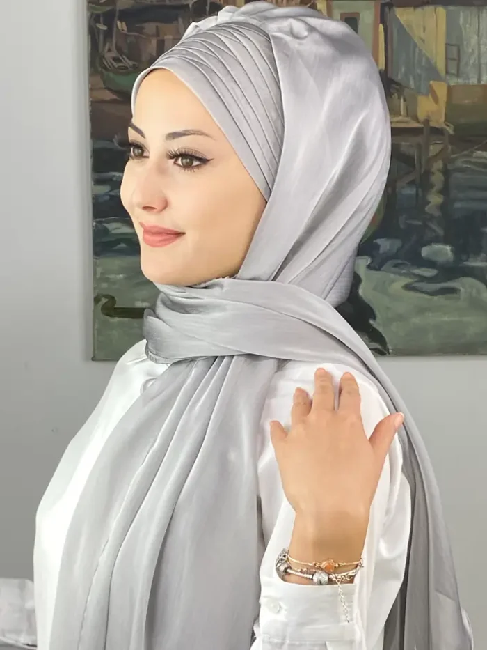 Açık gri şal; beyaz, vizon, açık mavi, pembe ve gümüş tonlarıyla mükemmel uyum sağlar. Gümüş veya inci aksesuarlarla desteklendiğinde klasik zarafeti vurgular.