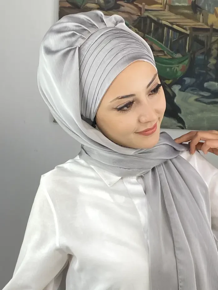 Fransız şifonun akıcı dokusu, başta mükemmel bir düşüş sağlar. Hafif ve nefes alan yapısı terletmeden gün boyu konfor sunar. Drapeli kesim sayesinde şekil vermeye gerek kalmaz; iğnesiz kullanım kolaylığıyla pratiklik sağlar.