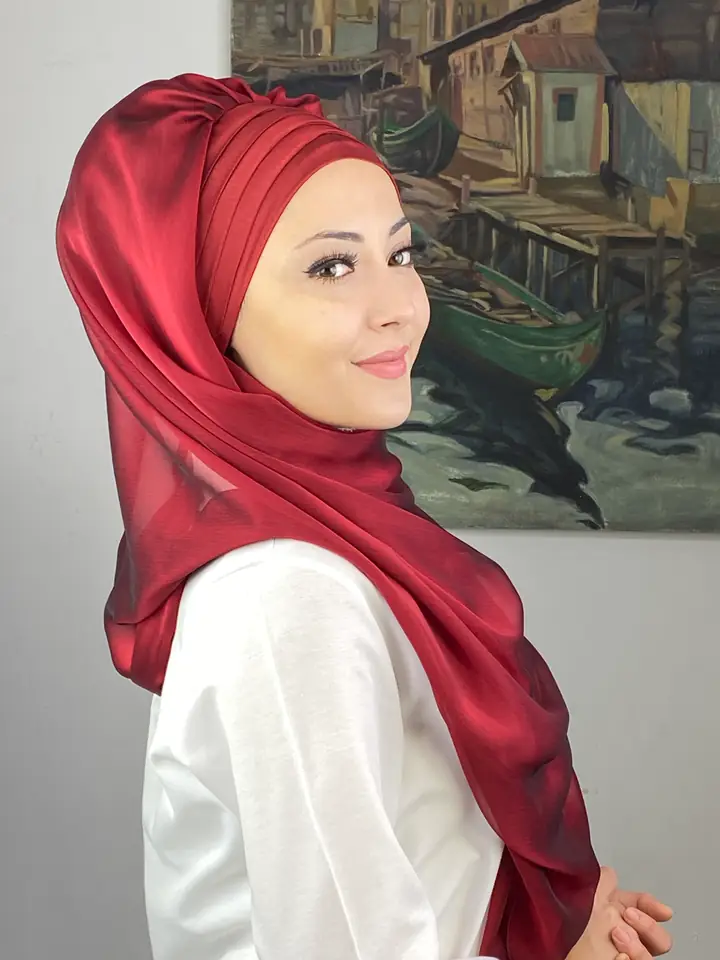Bordo rengin derinliği, sade şifonun mat ışıltısıyla dengelenir. Bu sayede dikkat çekici ama göz yormayan bir şıklık elde edilir. Günlük kombinlerden özel davetlere kadar geniş bir kullanım alanına sahiptir.