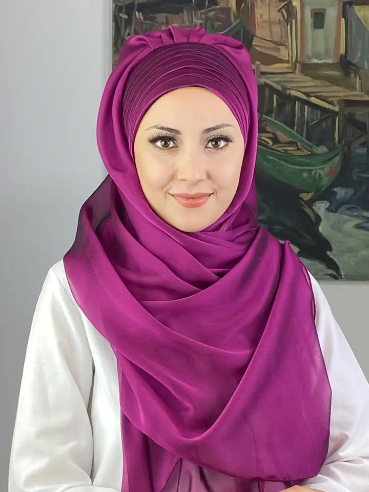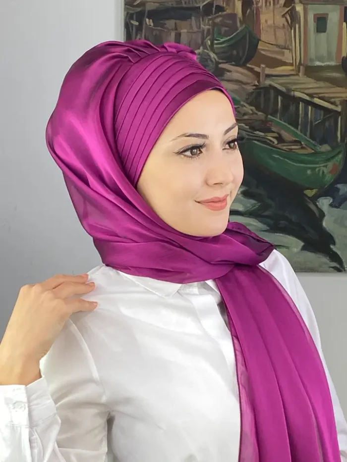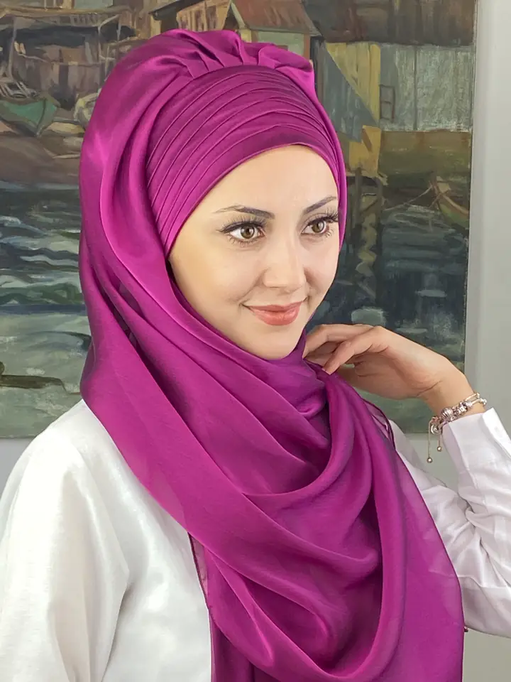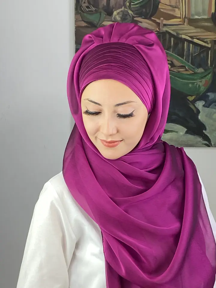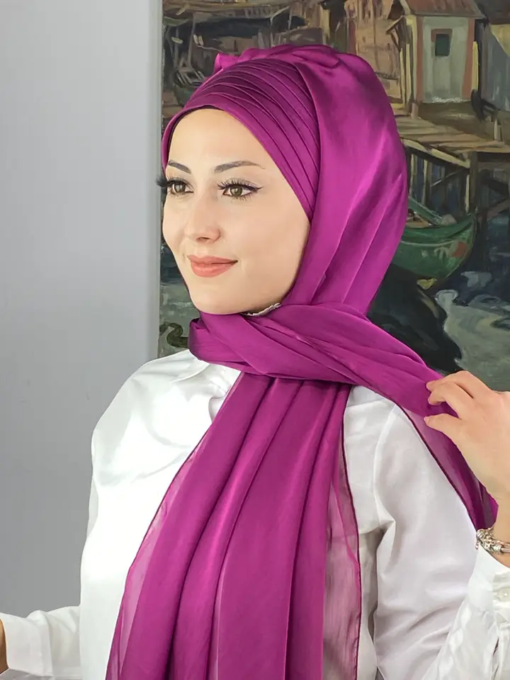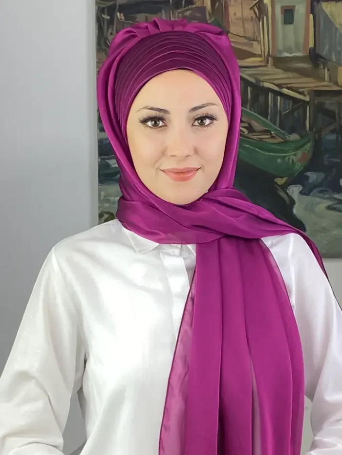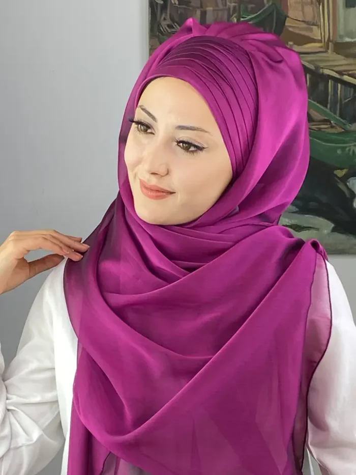 Fransız şifon kumaş, hafifliği ve nefes alan yapısıyla bilinir. Başta ağırlık hissi yaratmadan gün boyu konfor sunar. Drapeli formu sayesinde kolay şekil alır, iğnesiz kullanım rahatlığı sağlar. Fuşyanın parlak tonu, mat şifon dokusuyla dengelenerek abartısız ama etkileyici bir görünüm oluşturur.