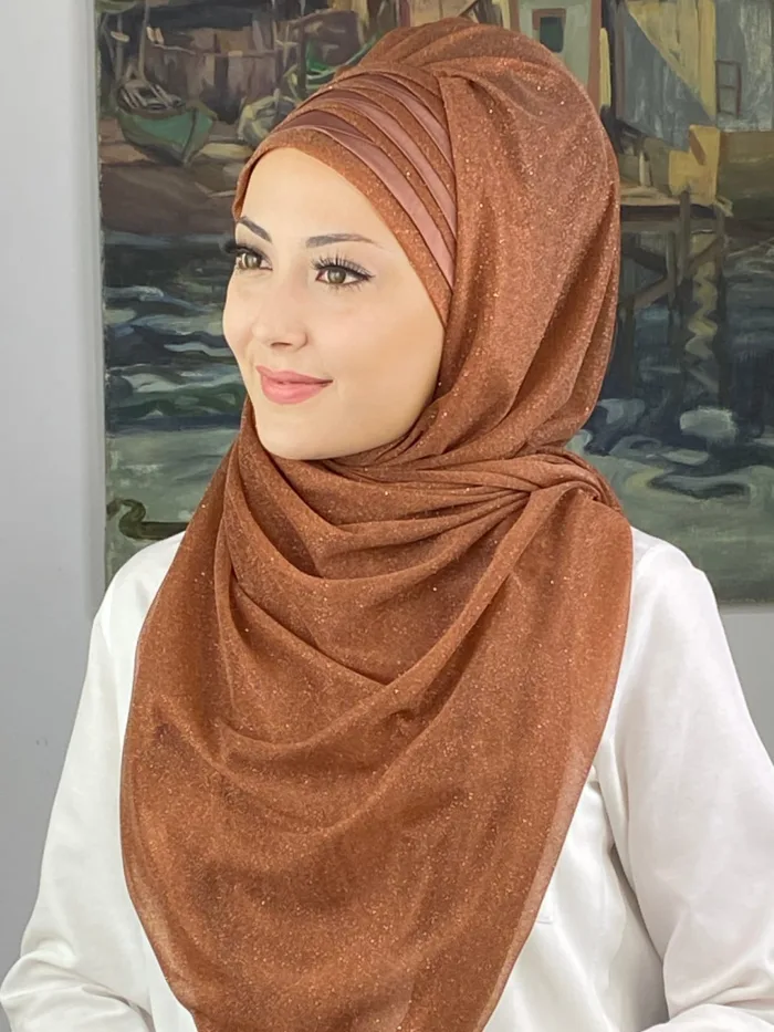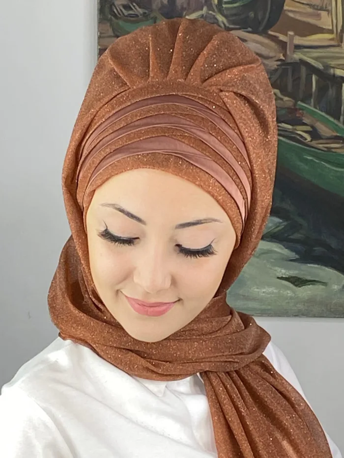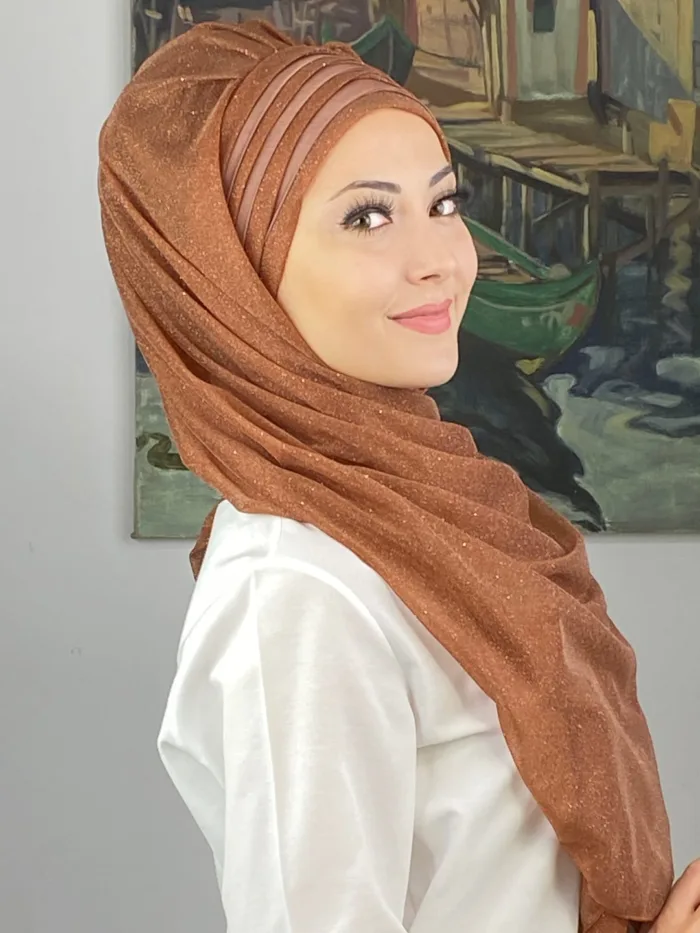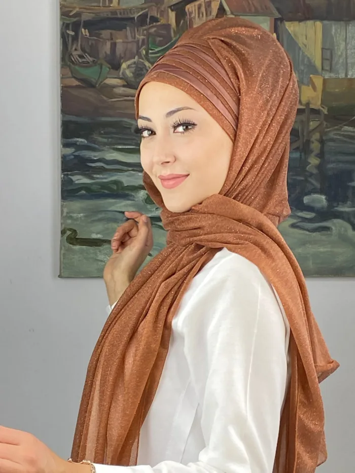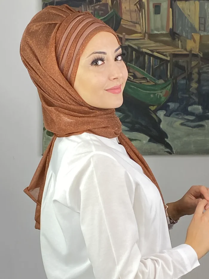 Topkapı Model Çapraz Drapeli Fransız Şifon Simli Şal – Açık Sütlü Kahve