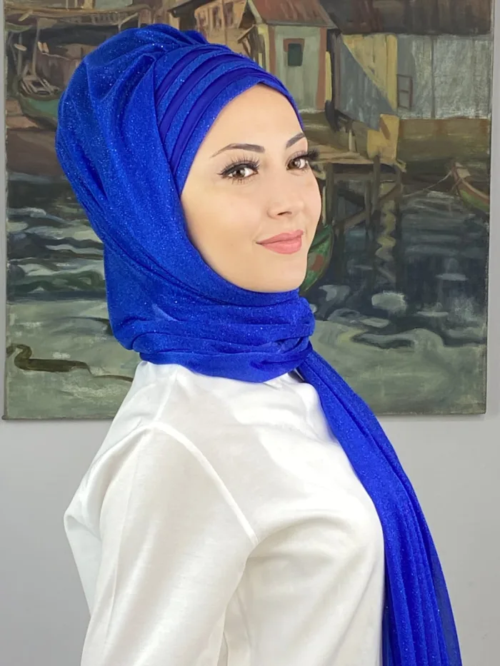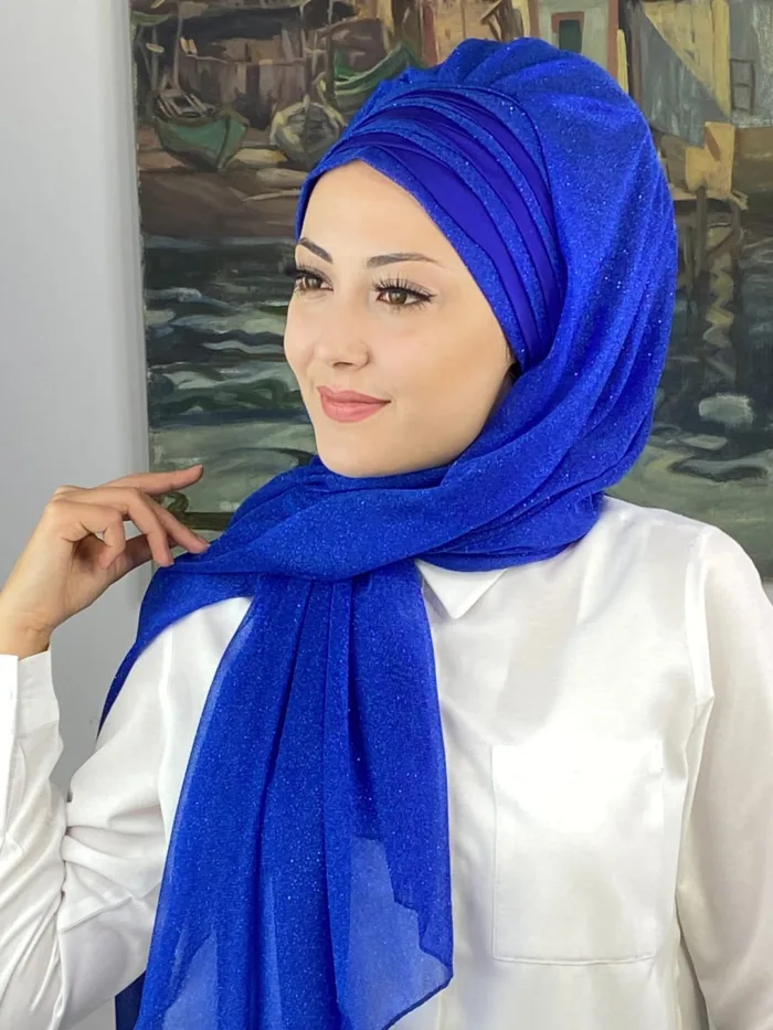 Topkapı Model Çapraz Drapeli Fransız Şifon Simli Şal – Saks Mavi
