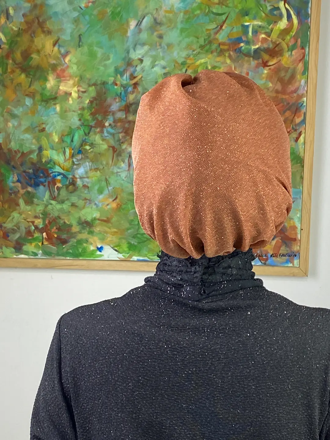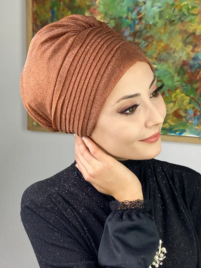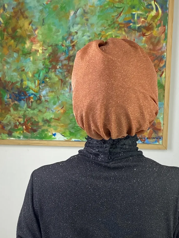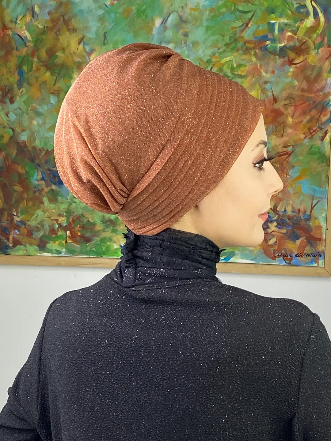 Açık bakır yan drapeli bone, zarif detayları ve modern formu ile özel bir görünüm sunar.