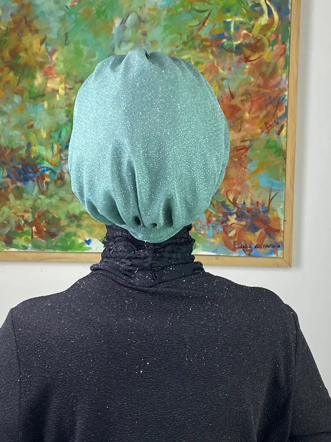 Açık zümrüt yan drapeli bone; beyaz, gri, altın, somon ve bej tonlarıyla mükemmel bir uyum yakalar.