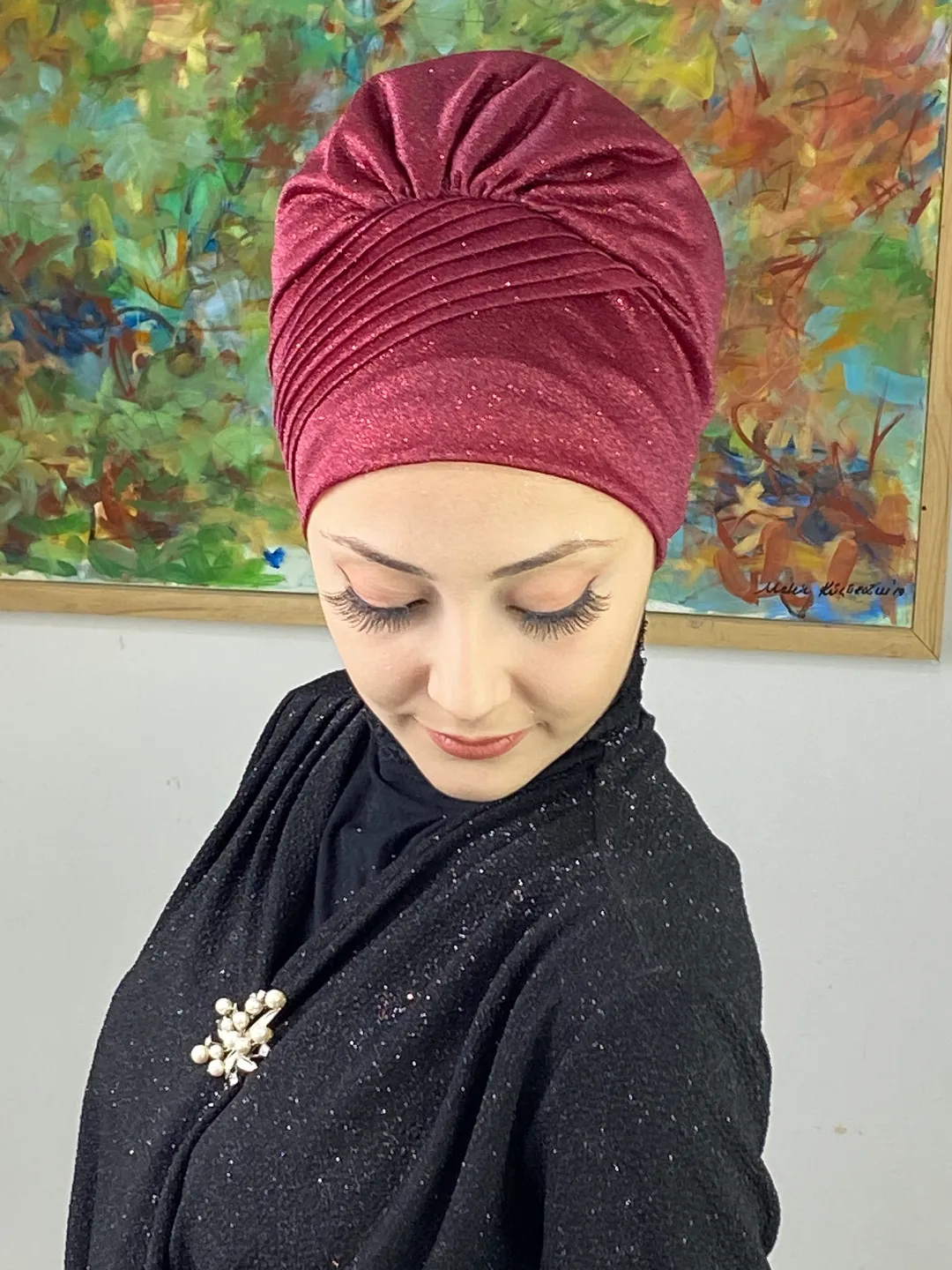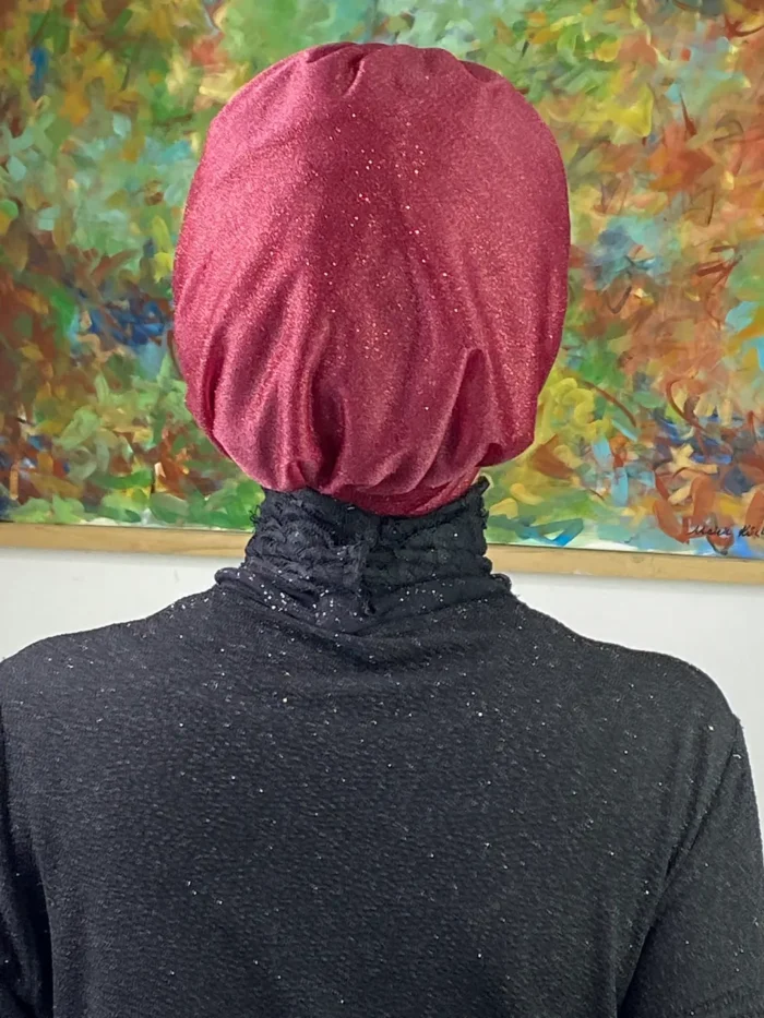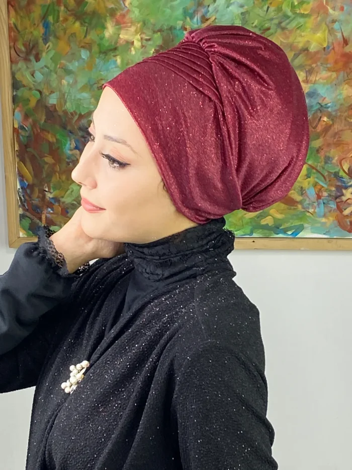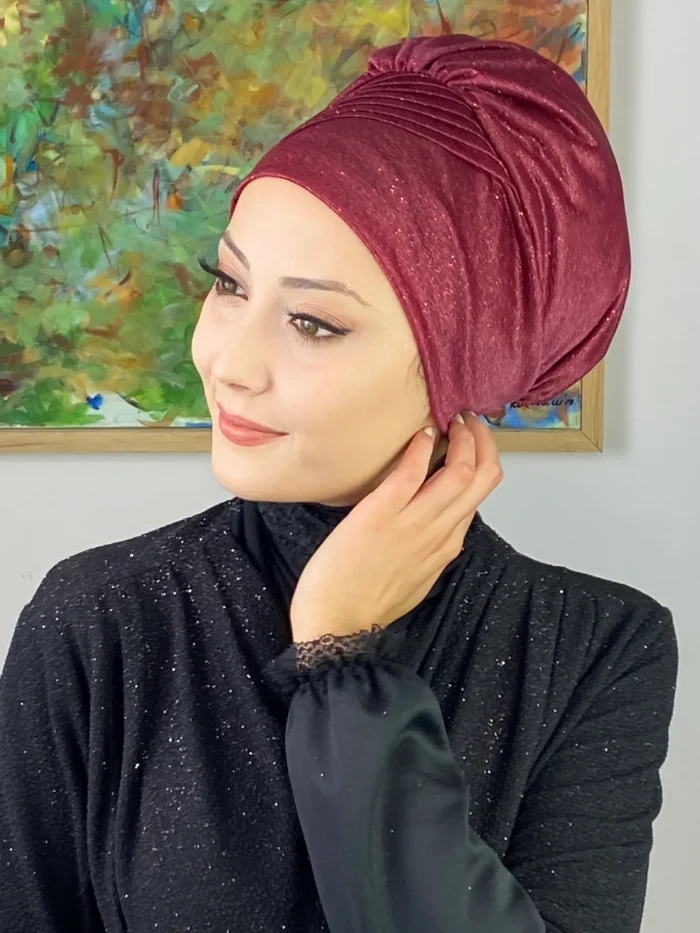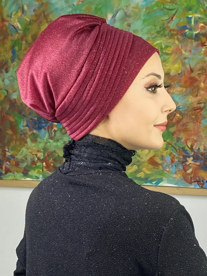Bordo yan drapeli bone; siyah, krem, gri, altın ve beyaz tonlarıyla kusursuz bir uyum sağlar.