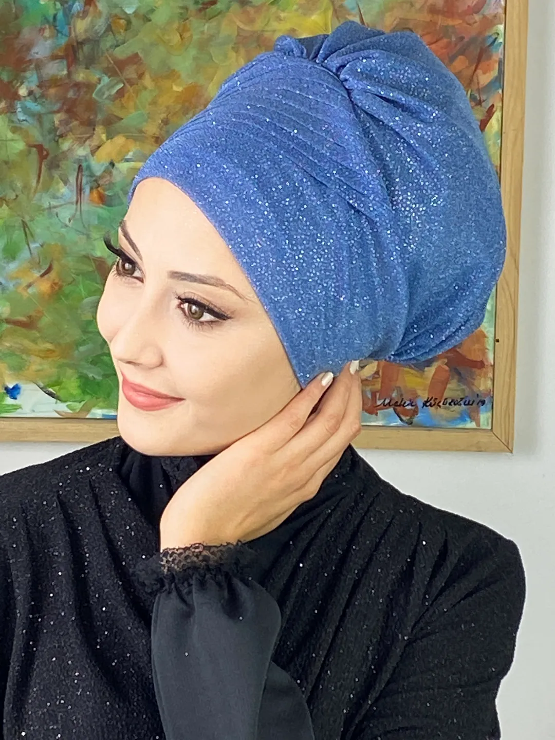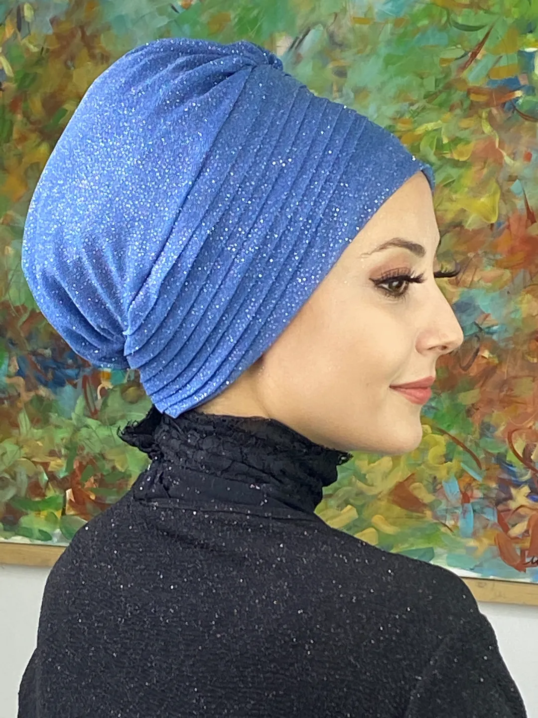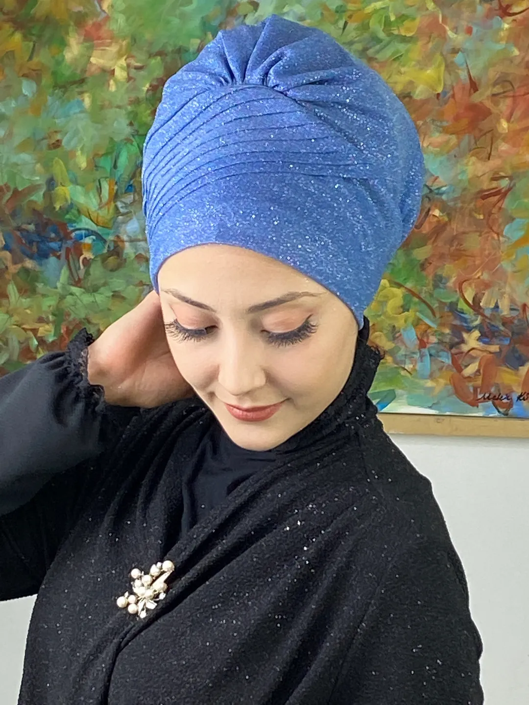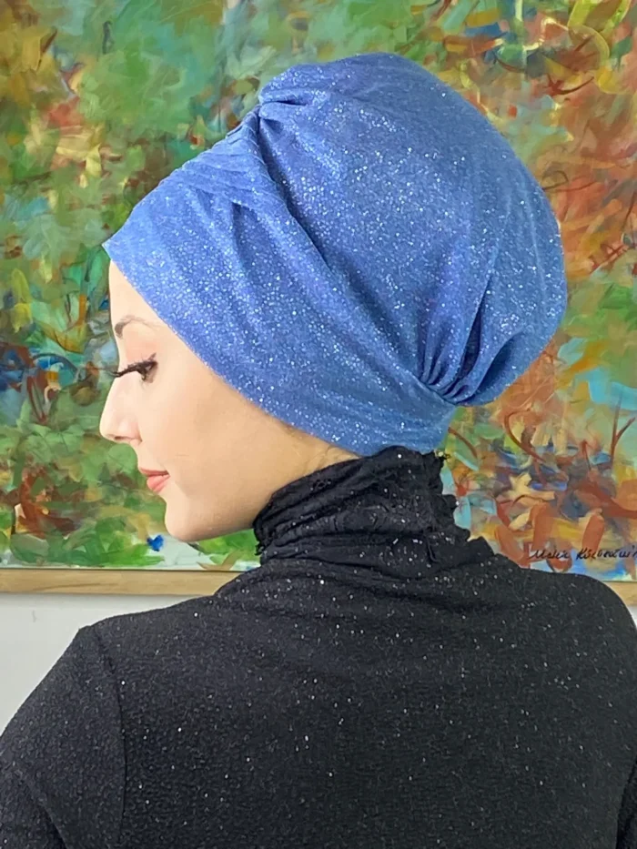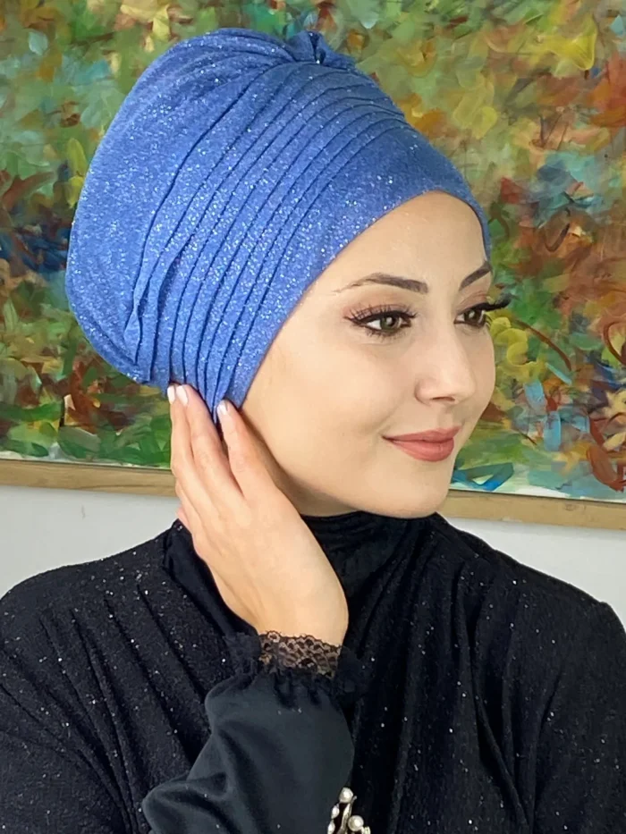 Indigo mavi yan drapeli bone, zarafeti ve rahatlığı bir araya getirerek tesettür kombinlerinize modern bir hava katar.