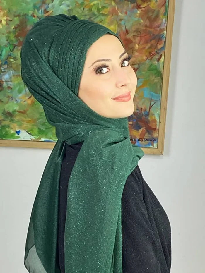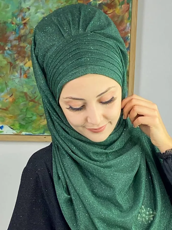 Yakut Yeşili, Topkapı Simli Çapraz Drapeli Hazır Şal ile birleştiğinde özel günlerde sofistike ve göz alıcı bir şıklık sunar. Yakut yeşilinin derin ve canlı tonu, simli şifon dokusuyla birleşerek abiye kombinlerde fark yaratan bir son dokunuş sağlar. Çapraz drape tasarımı, yüz hatlarını toplar ve başta kusursuz bir duruş sağlar. Simli detaylar ışıkla buluştuğunda tüm bakışlar üzerinize çevrilir.