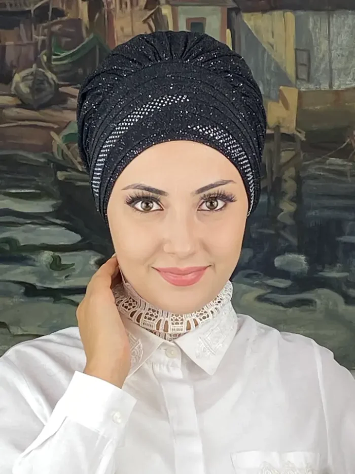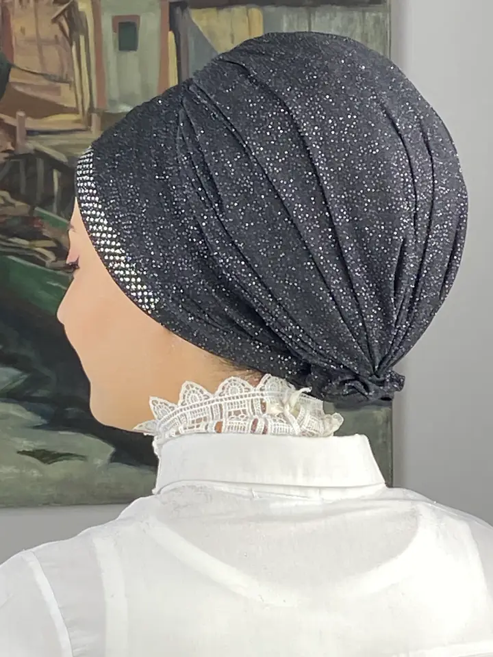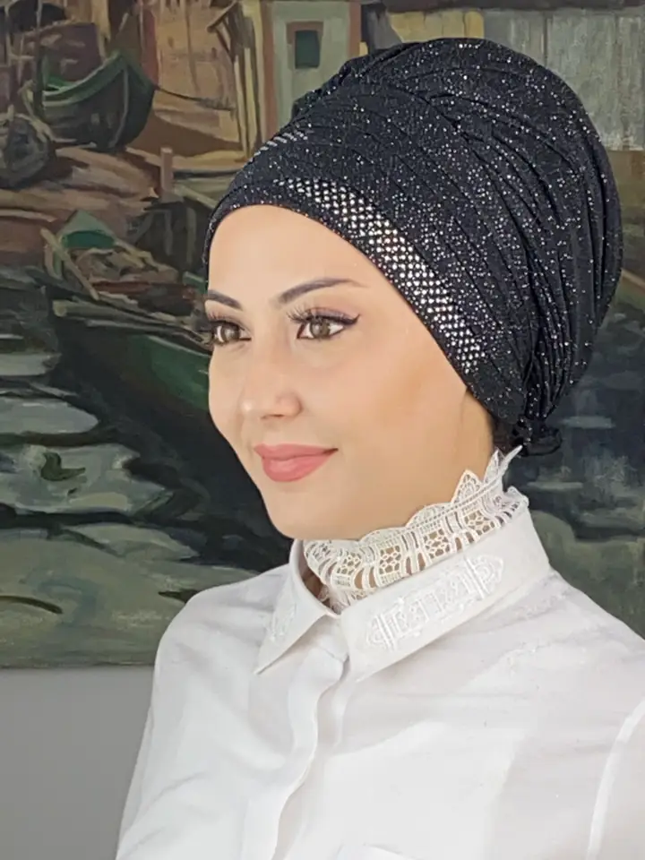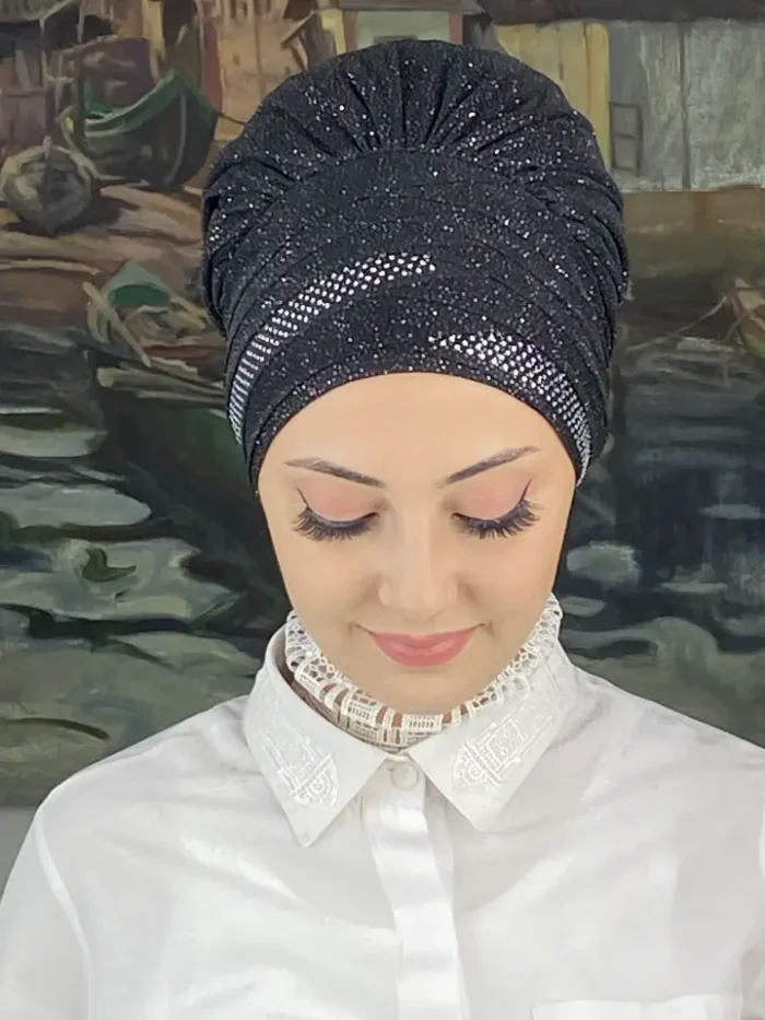 Trend Çapraz Drapeli İkili Taşlı Bone Şal – Koyu Gri – Simli 🌫