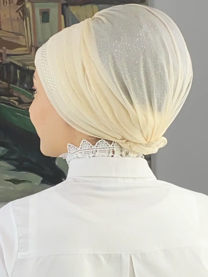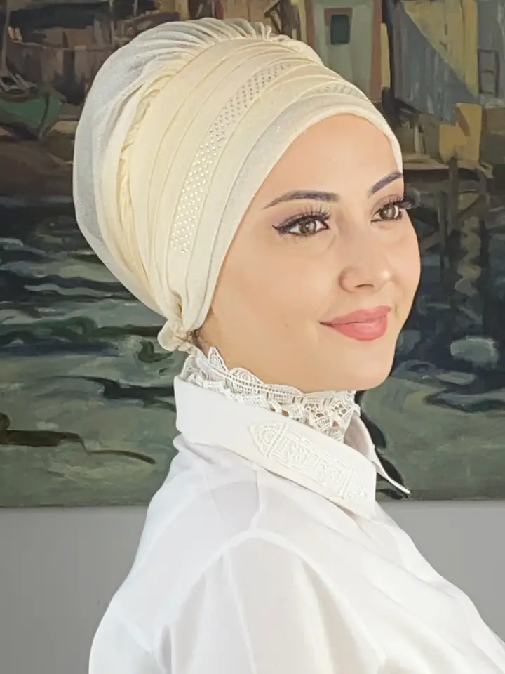 Trend Çapraz Drapeli İkili Taşlı Bone Şal – Krem 🤍