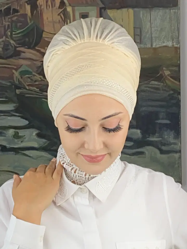 Krem şıklığını yakalamak için Trend Çapraz Drapeli İkili Taşlı Bone Şal – Krem’i hemen sipariş edin!