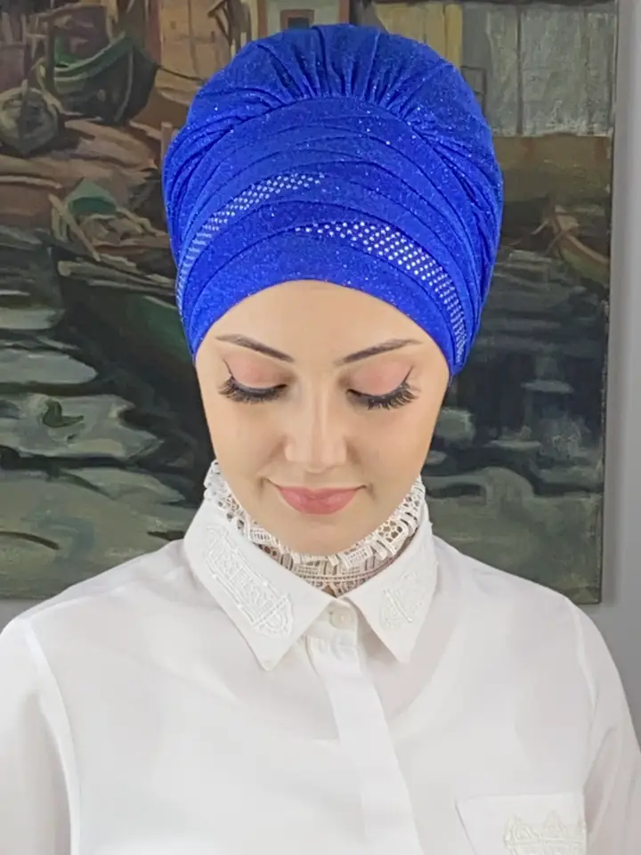 Trend Çapraz Drapeli İkili Taşlı Bone Şal – Saks Mavisi