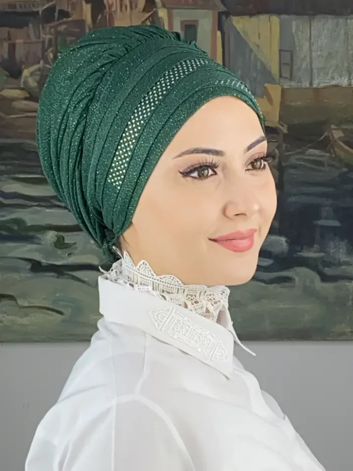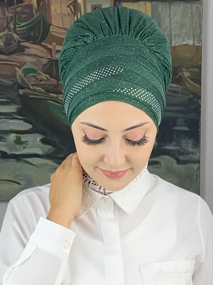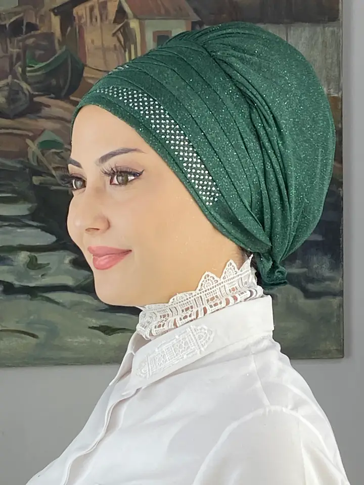 Trend Çapraz Drapeli İkili Taşlı Bone Şal – Zümrüt Yeşili