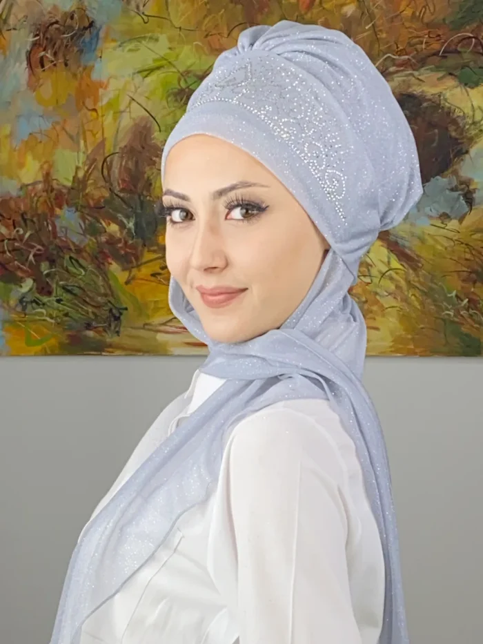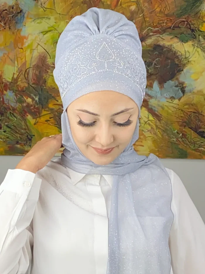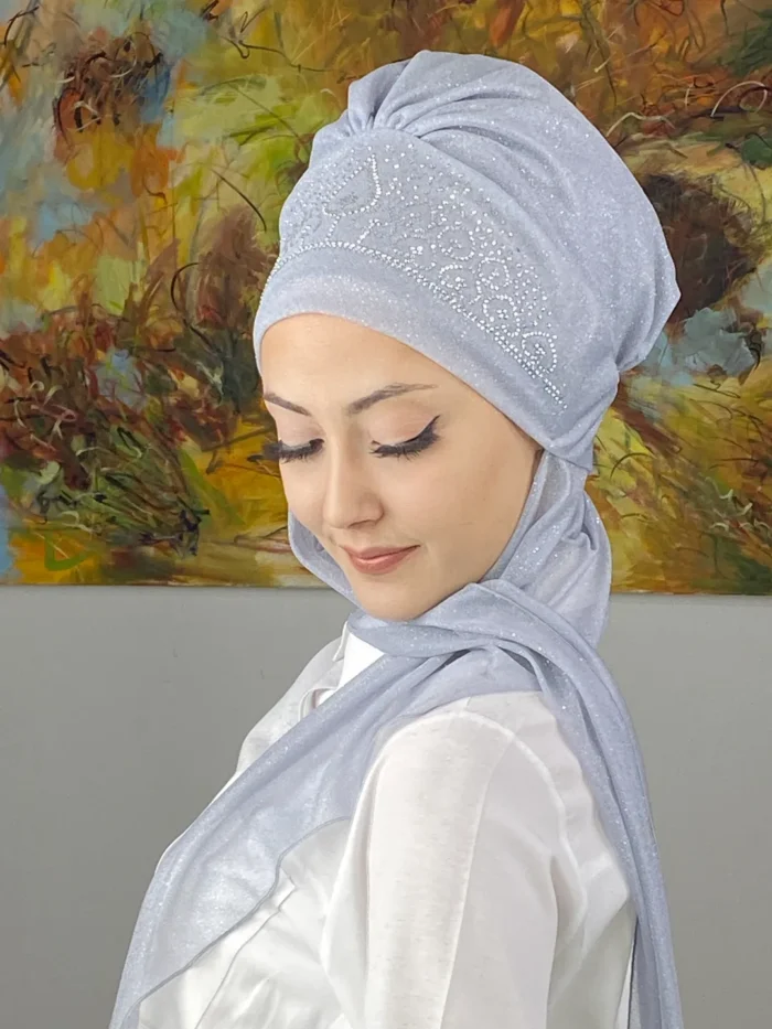 Vintage Model Taşlı Abiye Atkılı Bone Şal – Açık Gri, sade bir zarafeti temsil eder.