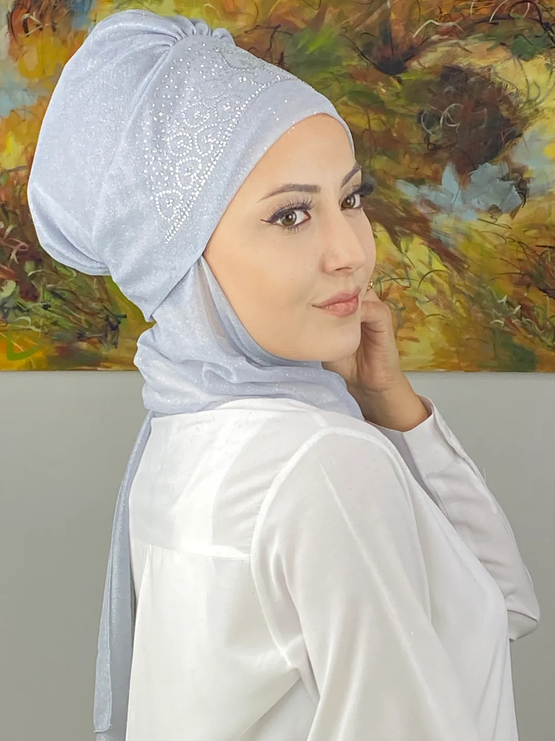Vintage Model Taşlı Abiye Atkılı Bone Şal – Açık Gri