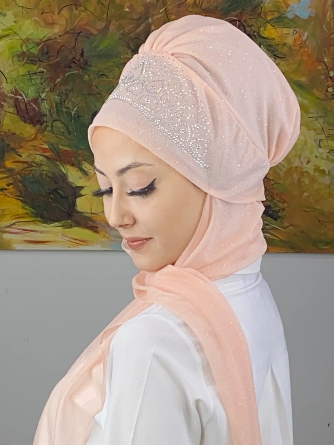 Vintage Model Taşlı Abiye Atkılı Bone Şal – Açık Somon 🌼