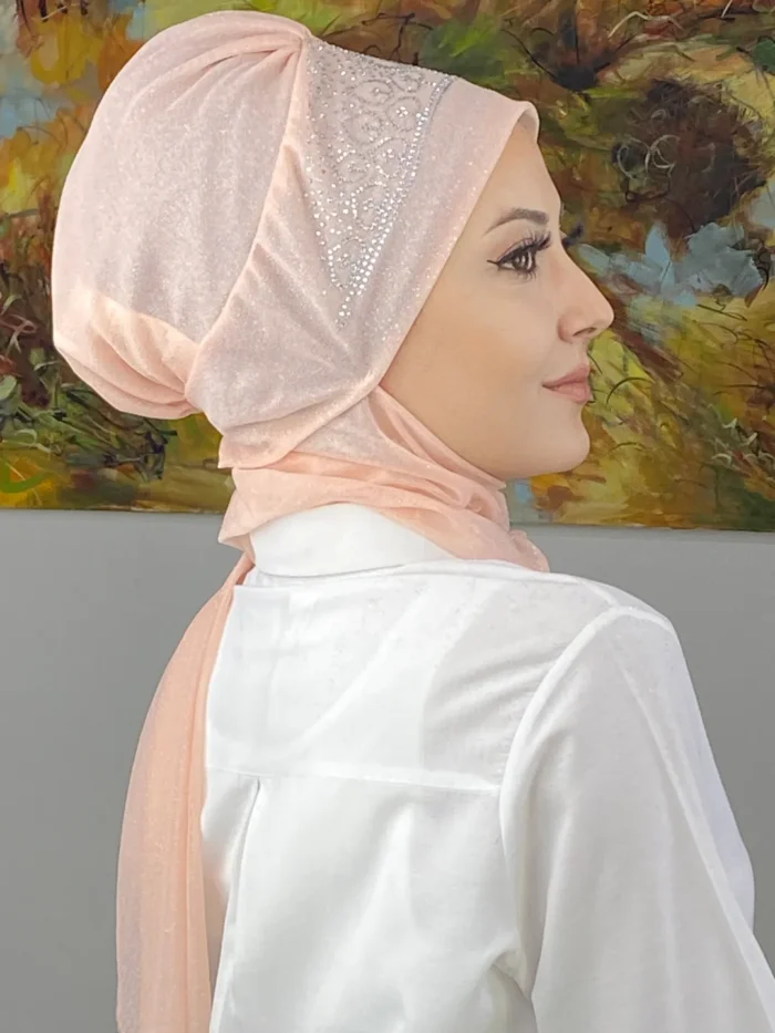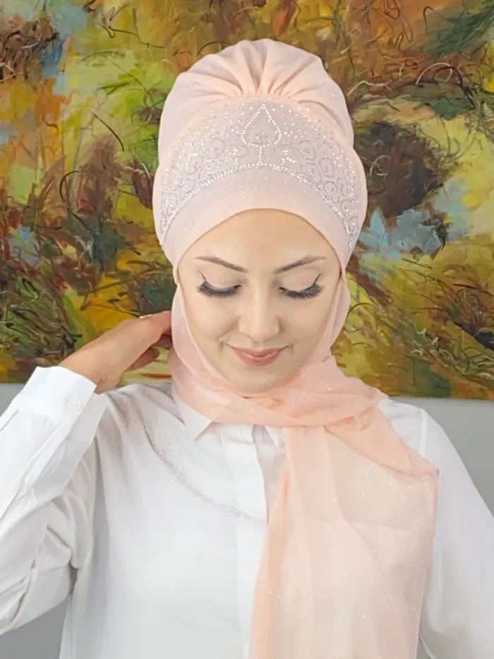 Vintage Model Taşlı Abiye Atkılı Bone Şal – Açık Somon