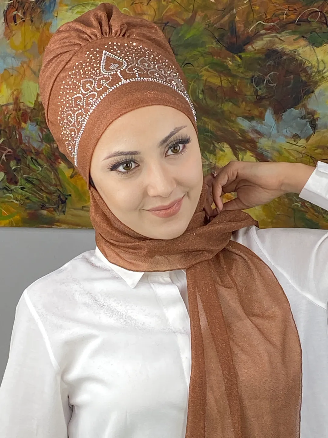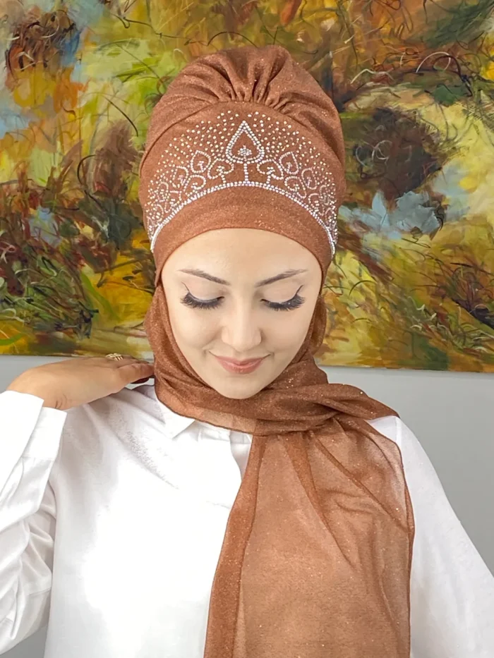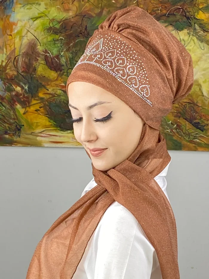 Vintage Model Taşlı Abiye Atkılı Bone Şal – Bakır 🧡