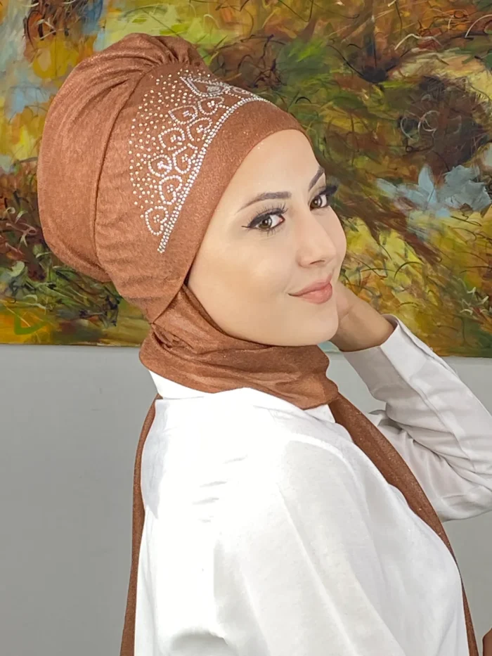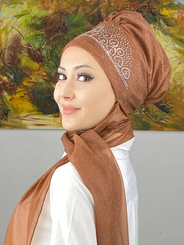 Vintage Model Taşlı Abiye Atkılı Bone Şal – Bakır, sade ve asil bir tarzın temsilcisidir. Zarif taş işlemeleriyle ışıltıyı abartmadan sunar, abiye kombinlerinize lüks bir dokunuş ekler.