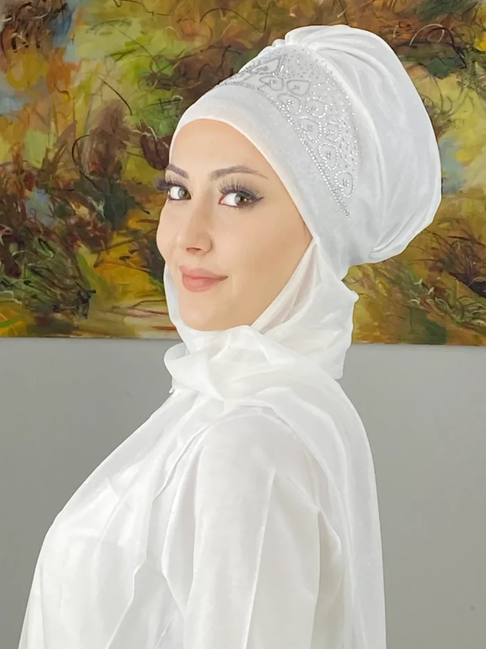 Vintage Model Taşlı Abiye Atkılı Bone Şal – Beyaz