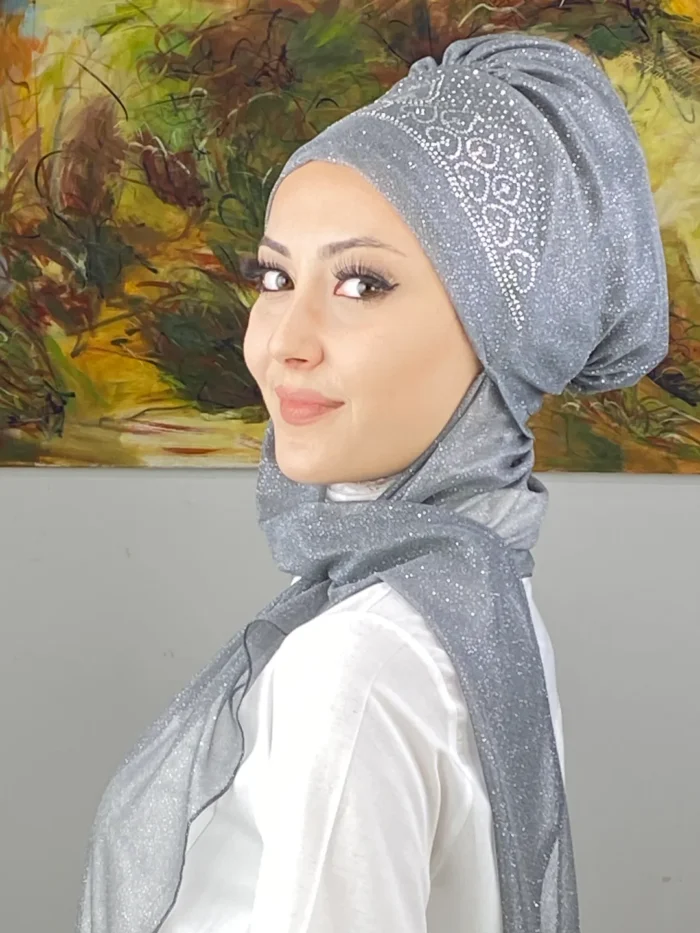 Vintage Model Taşlı Abiye Atkılı Bone Şal – Gri