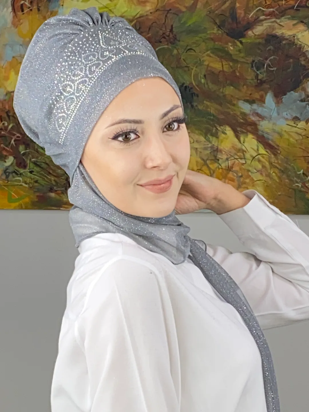 Vintage Model Taşlı Abiye Atkılı Bone Şal – Gri Zarafeti
