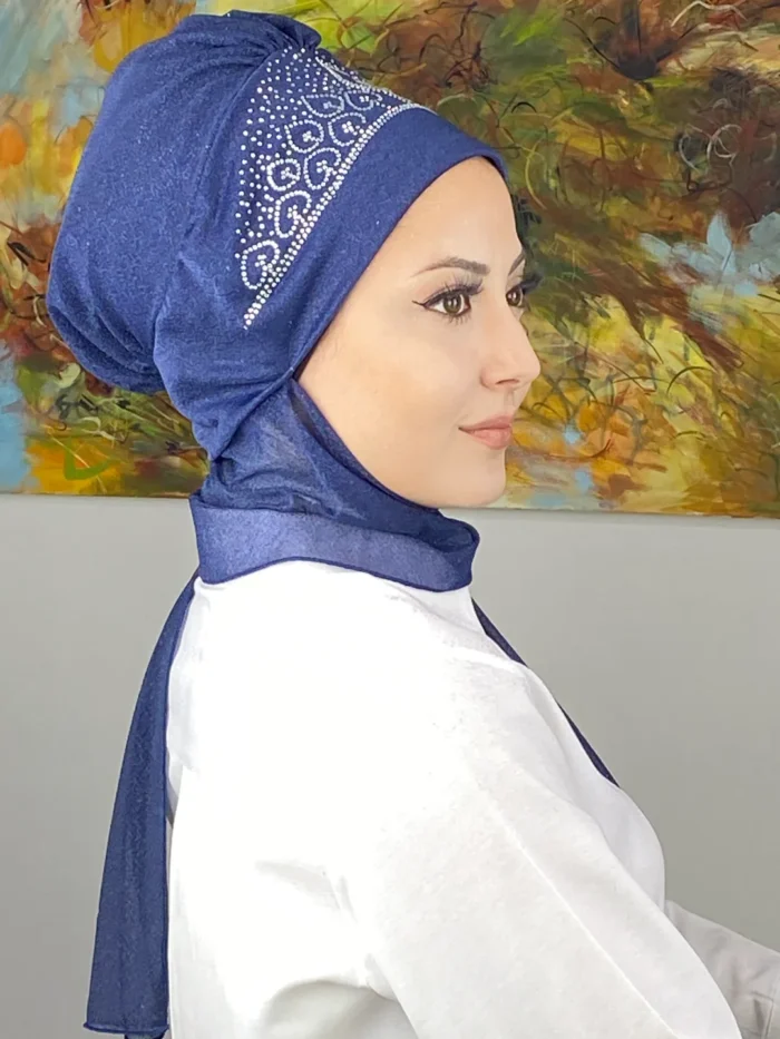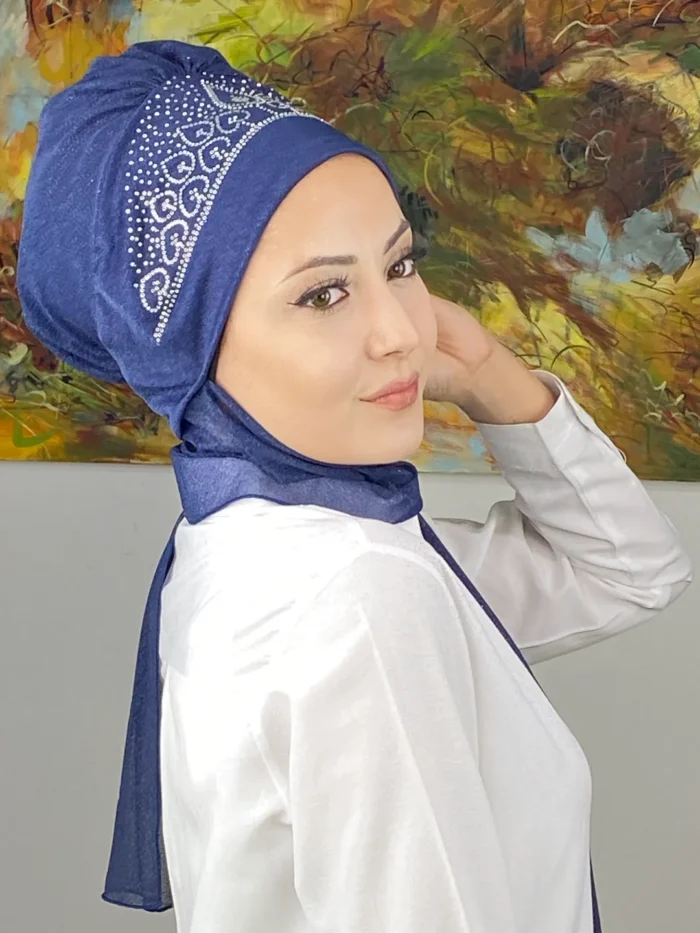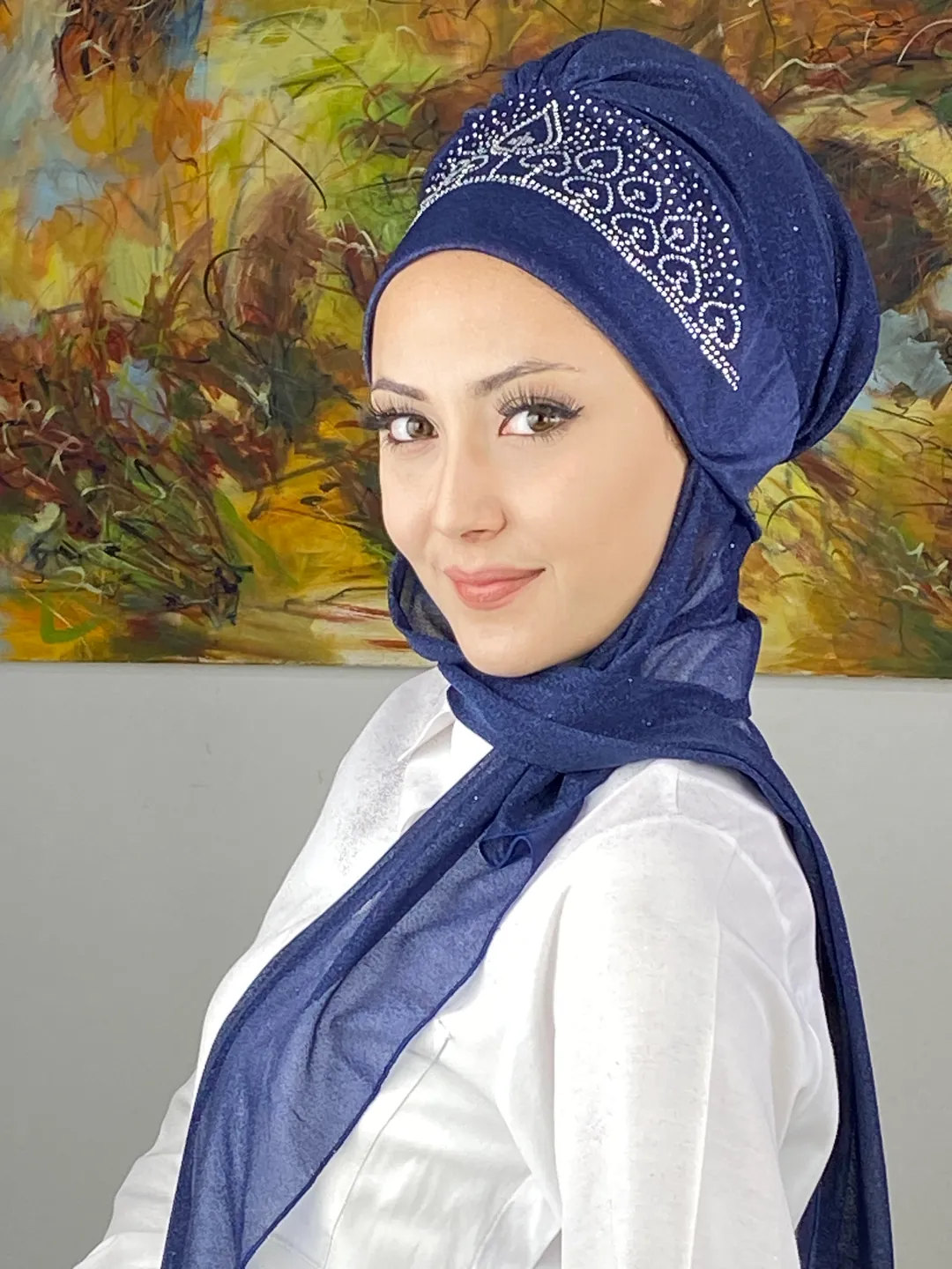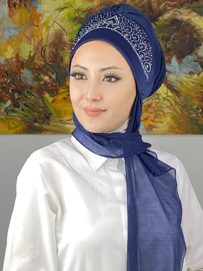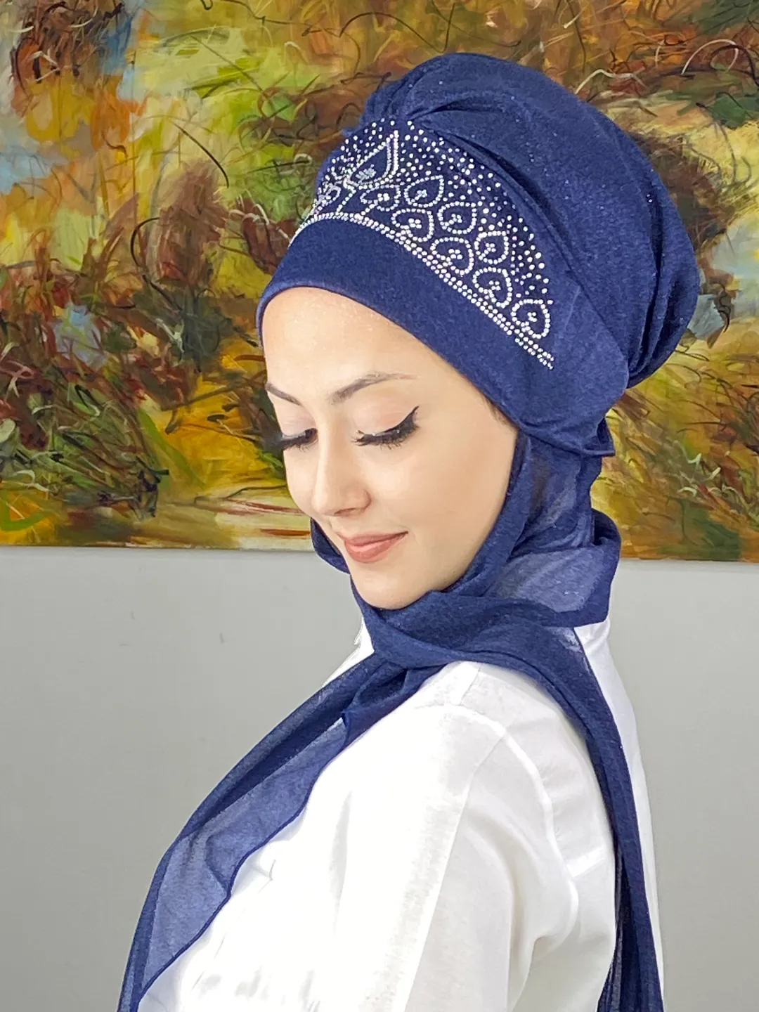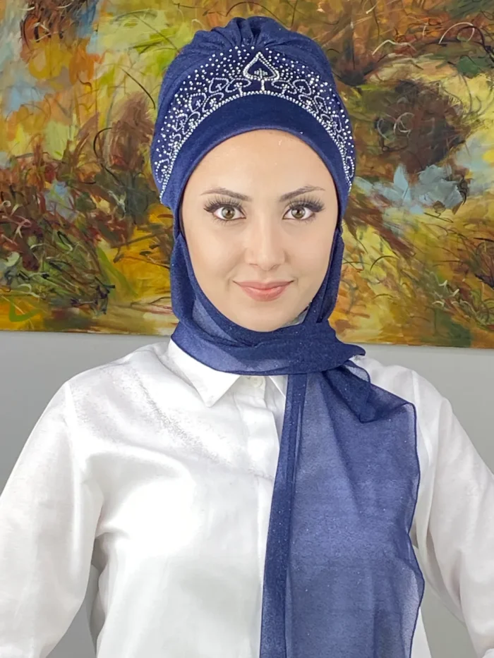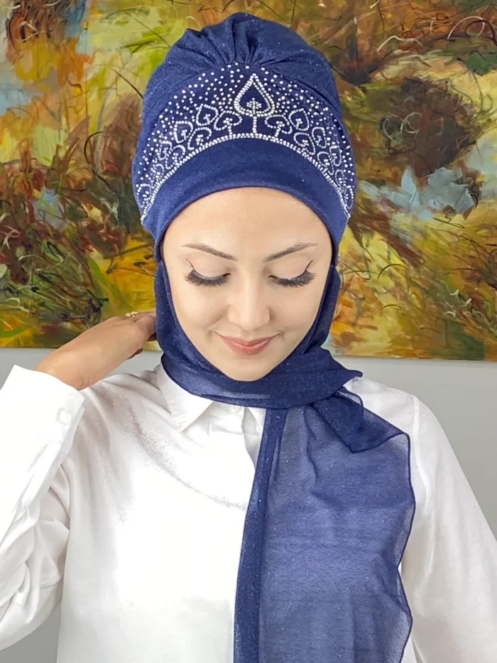 Vintage Model Taşlı Abiye Atkılı Bone Şal – Koyu Lacivert